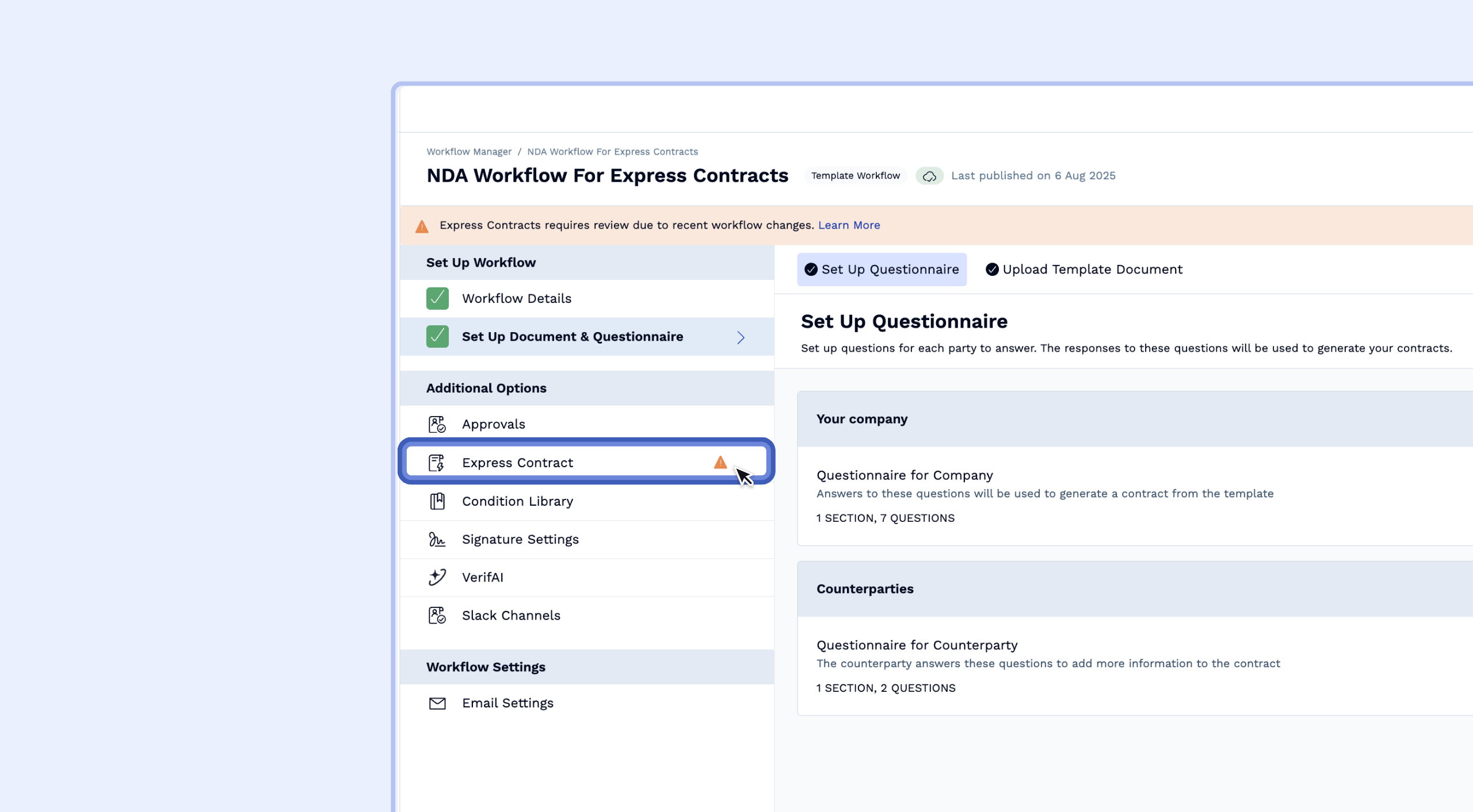 - Within the workflow you just edited, click on Express Contract in the left-hand navigation panel.