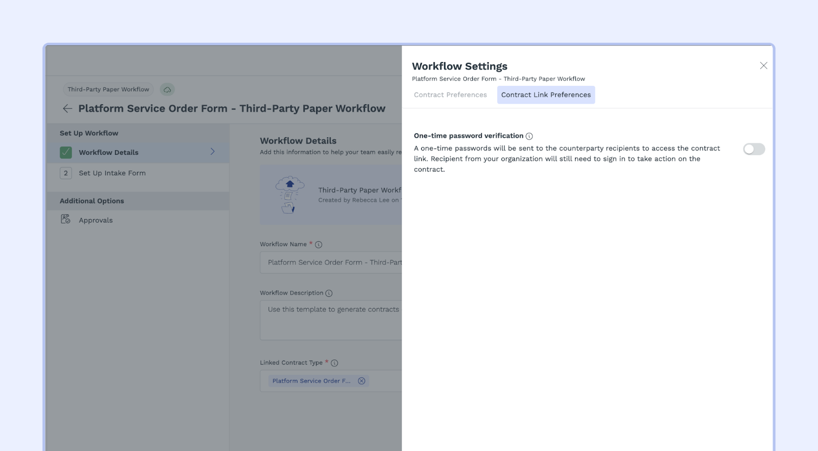 - Turn on the toggle to activate OTP for all contract links generated from this workflow.