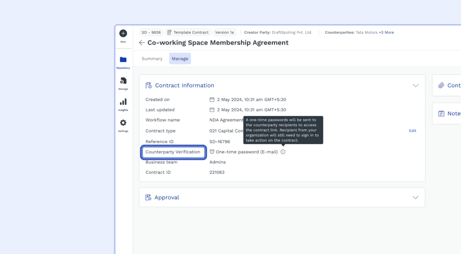 SpotDraft maintains a detailed audit trail that records the verification method used during contract signing. This ensures transparency and security for each transaction. Additionally, the information is also logged in the Activity Log.