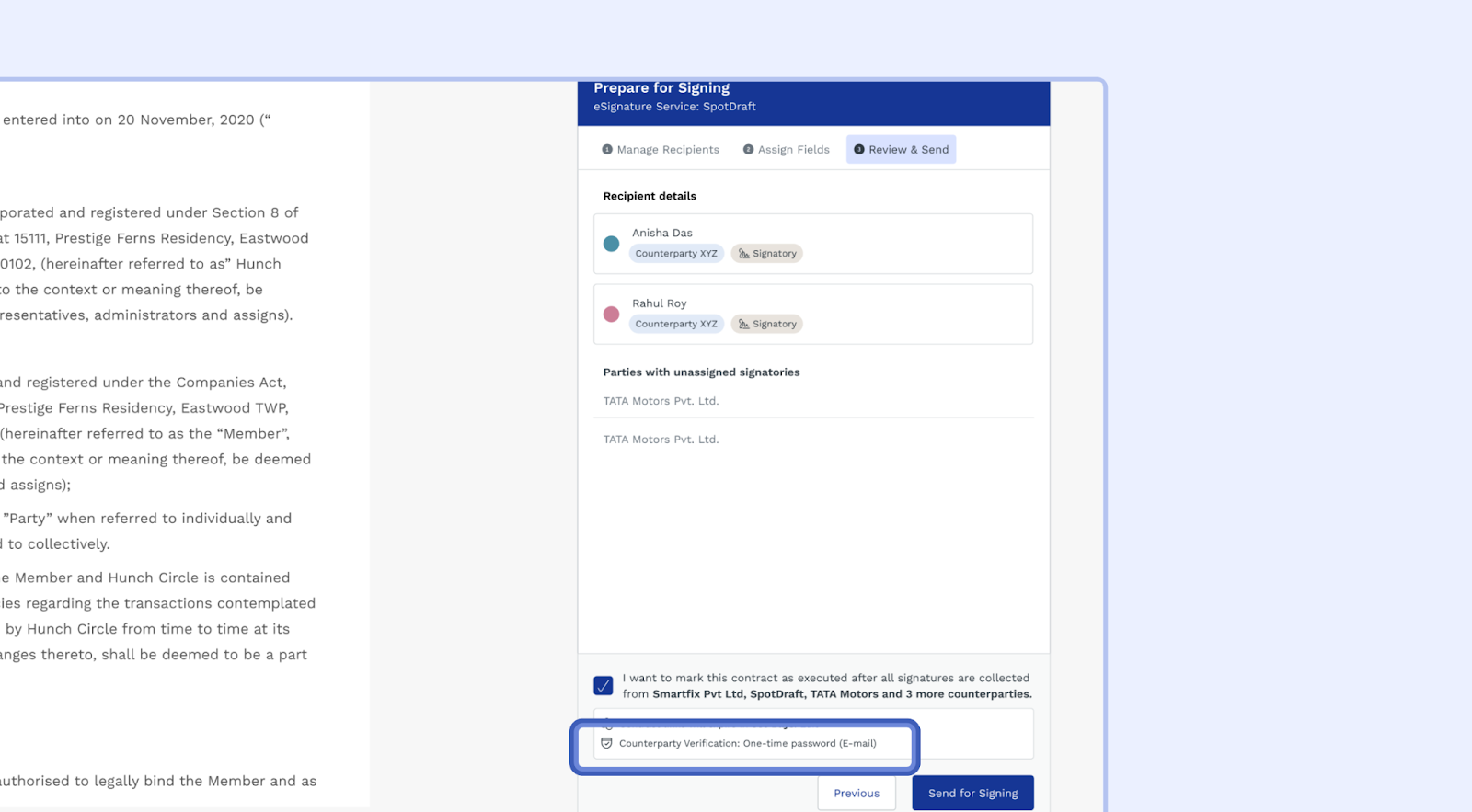 Review and Send(For Send for Review and Upload and Sign flow) : When preparing a contract for signing, you can view the 'Counterparty Verification' option in the 'Review and Send' step. `