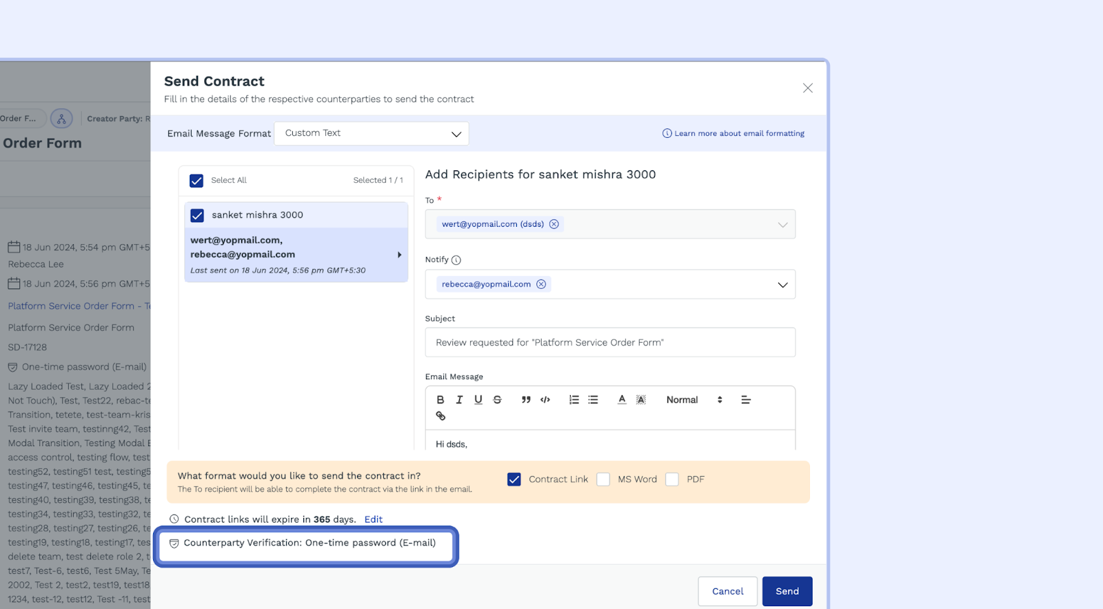 - Send Modal(For Template Contracts): To check if the Email-based OTP (One-Time Password) feature is enabled for a template contract, look for this option when you are sending the contract.