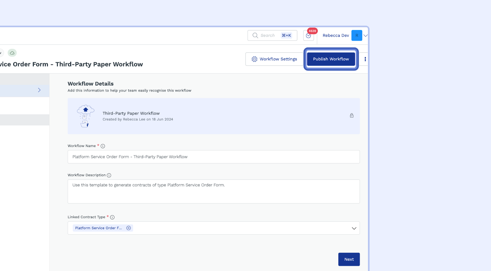 Publishing the workflow: To make sure the changes apply to all future contracts created through that workflow, publish the workflow.