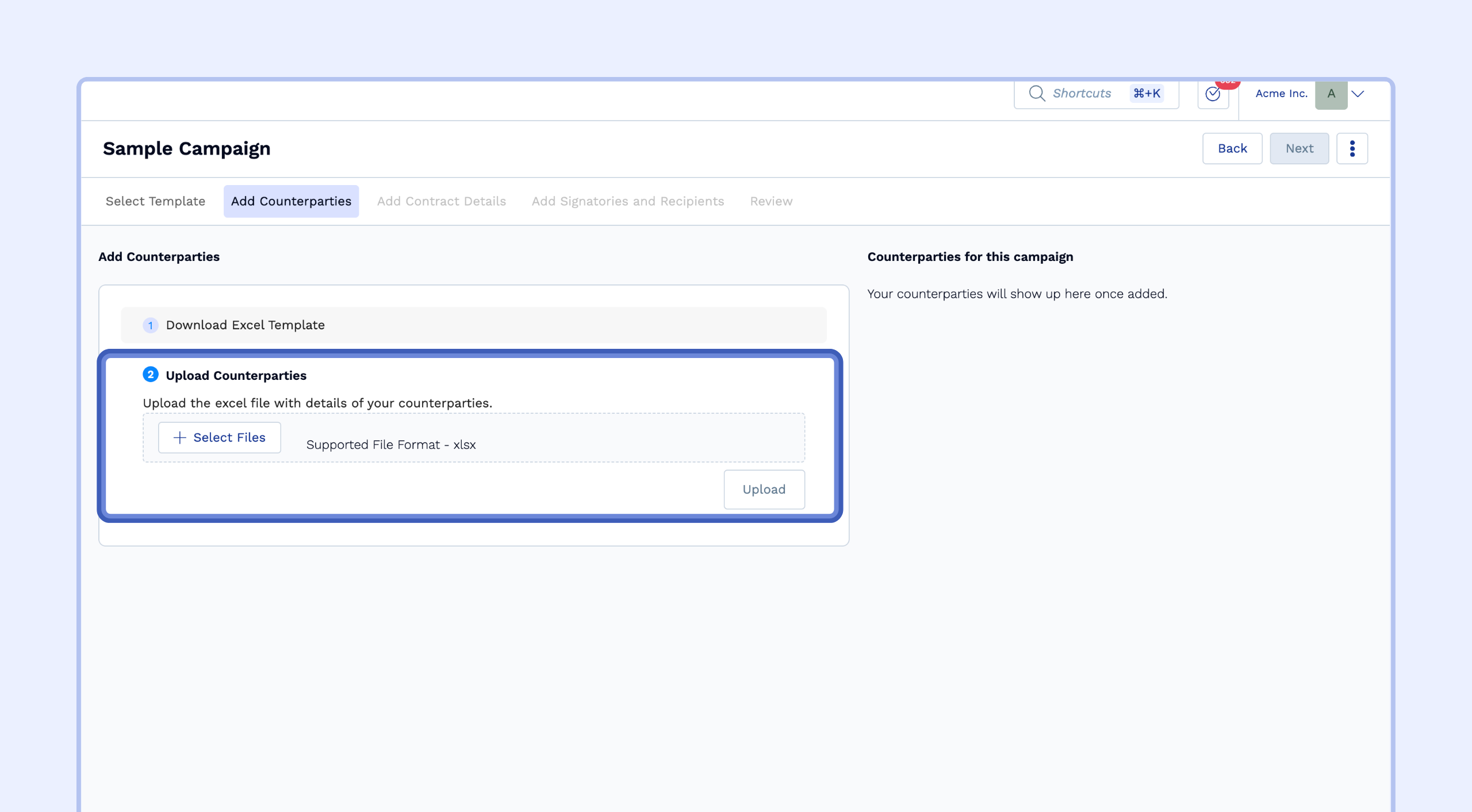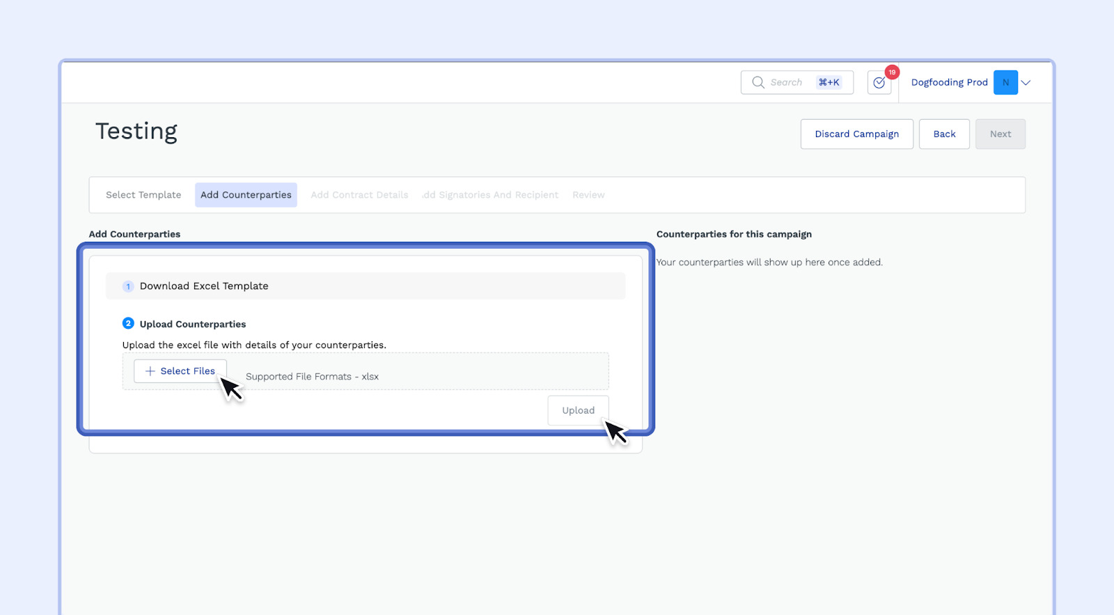 Once you have entered the basic details for your campaign, you'll need to add the counterparties you want to send contracts to. Here's how: