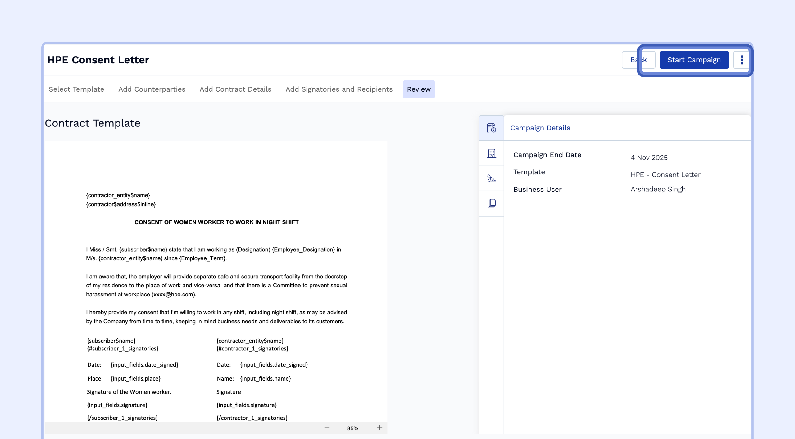 This is particularly useful for HR contracts, an example can be to send growth letters to more than 500 employees. This can be done in fraction of the time using Campaigns as compared to sending template contracts individually.