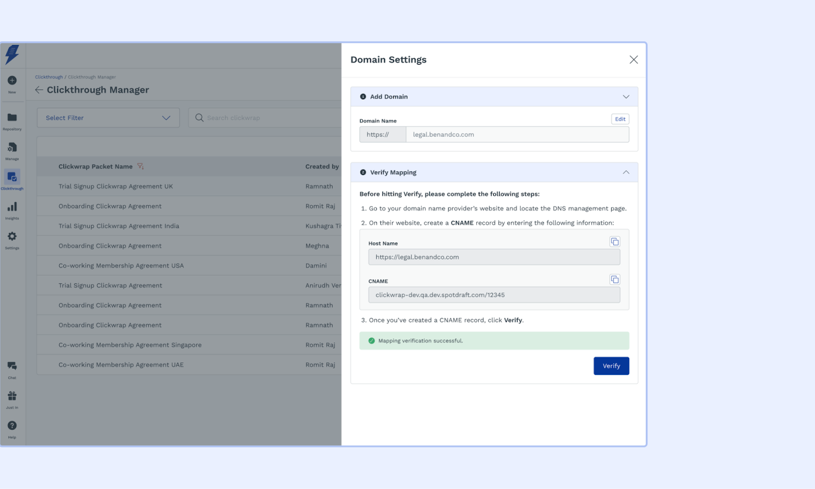SpotDraft Clickthrough allows you to host standard agreements from your domain. By default, the domain name of your agreement hosted on SpotDraft Clickthrough will be "clickwrap.in.spotdraft.com/workspace_id". However, you can personalize this so that your customers can access your standard agreements from a subdomain, such as 'legal.mycompany.com'. This feature is called domain/host mapping.