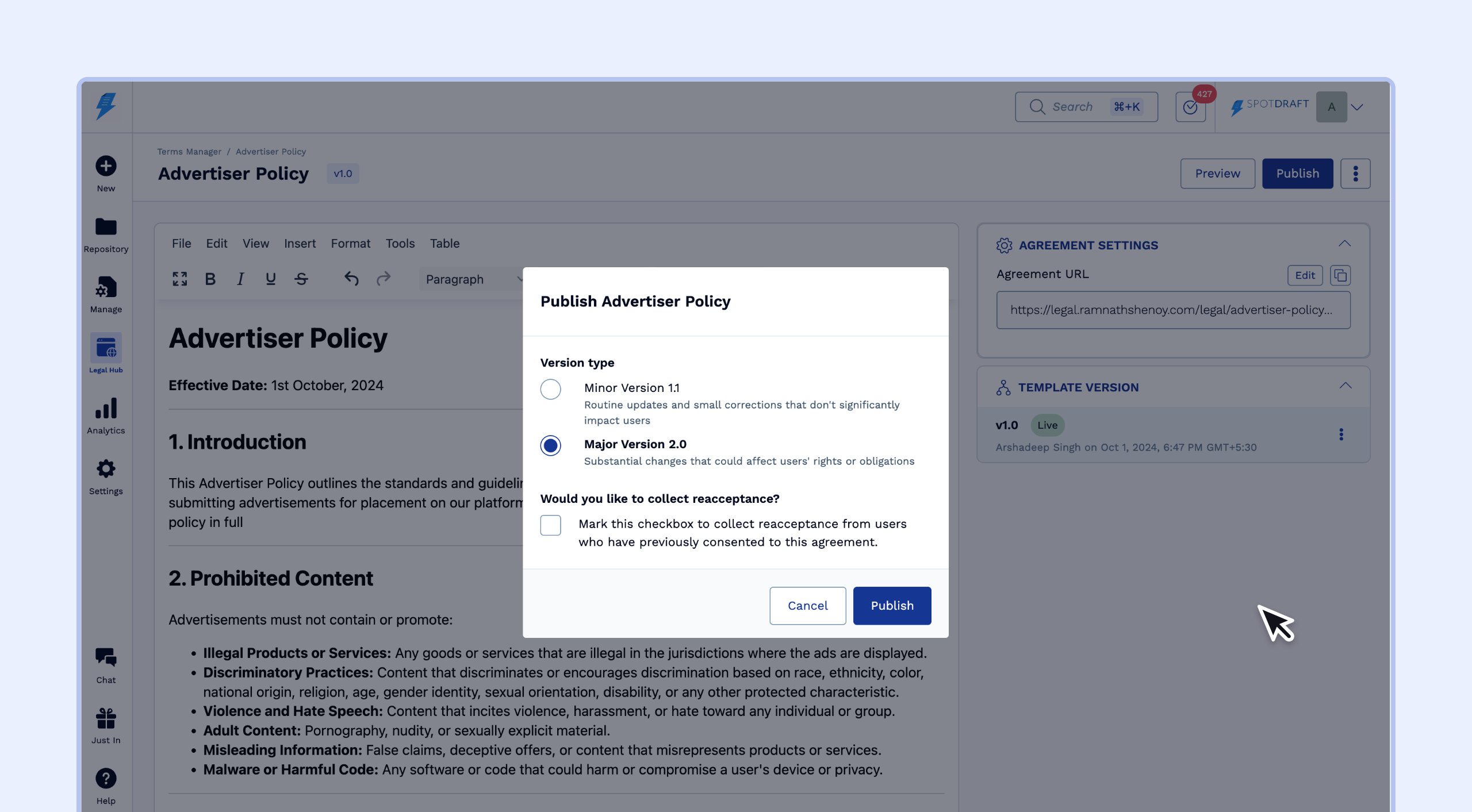 Creating online terms via Legal Hub Agreements