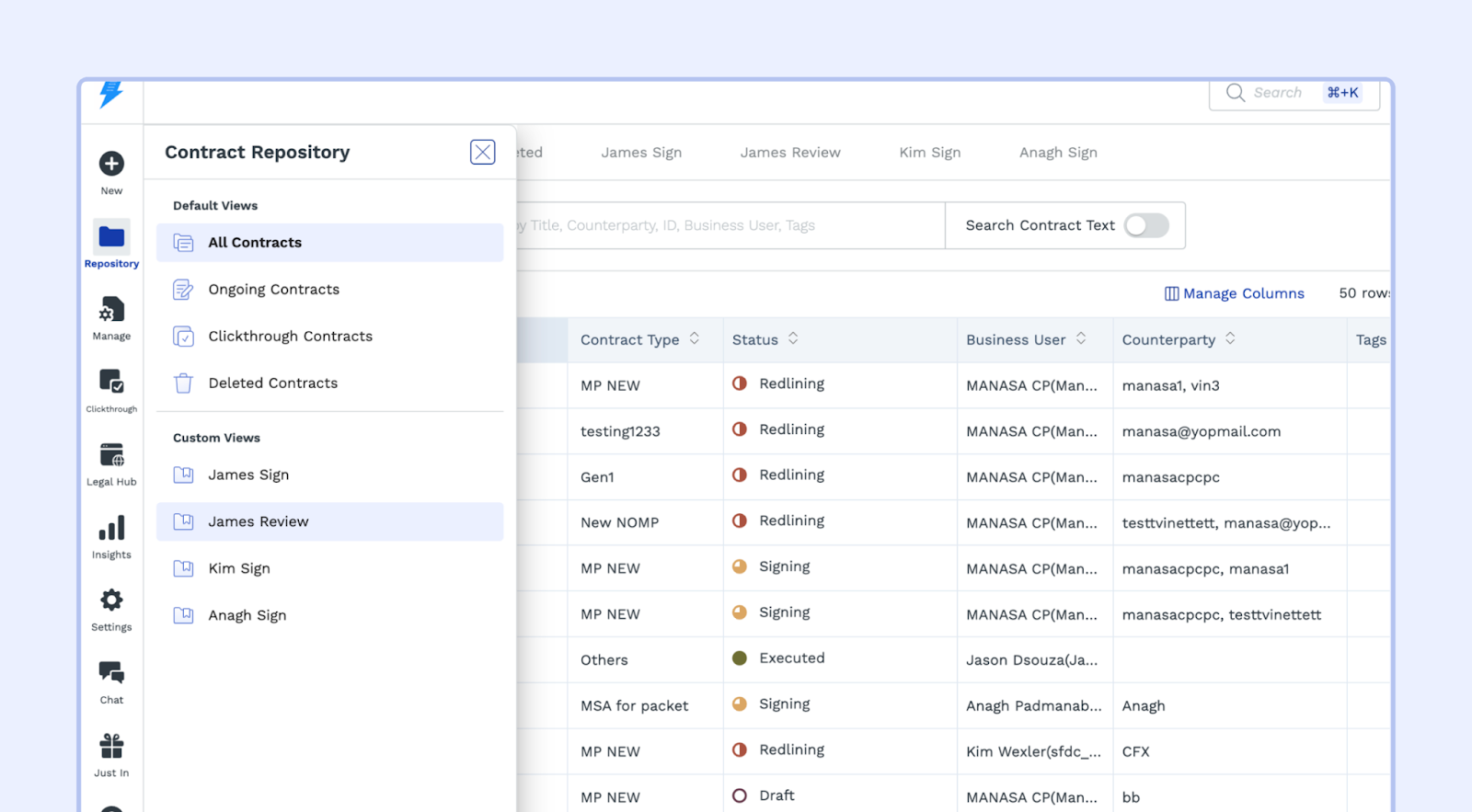 Import executed contracts: Upload your executed historical contracts to maintain a single, centralized record of all your contracts.RepositoryView all the default views such as All, Ongoing, Deleted, etc.View all your custom saved views