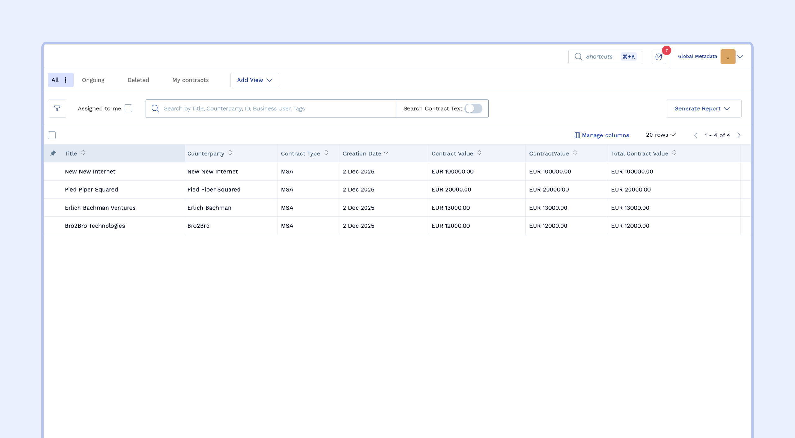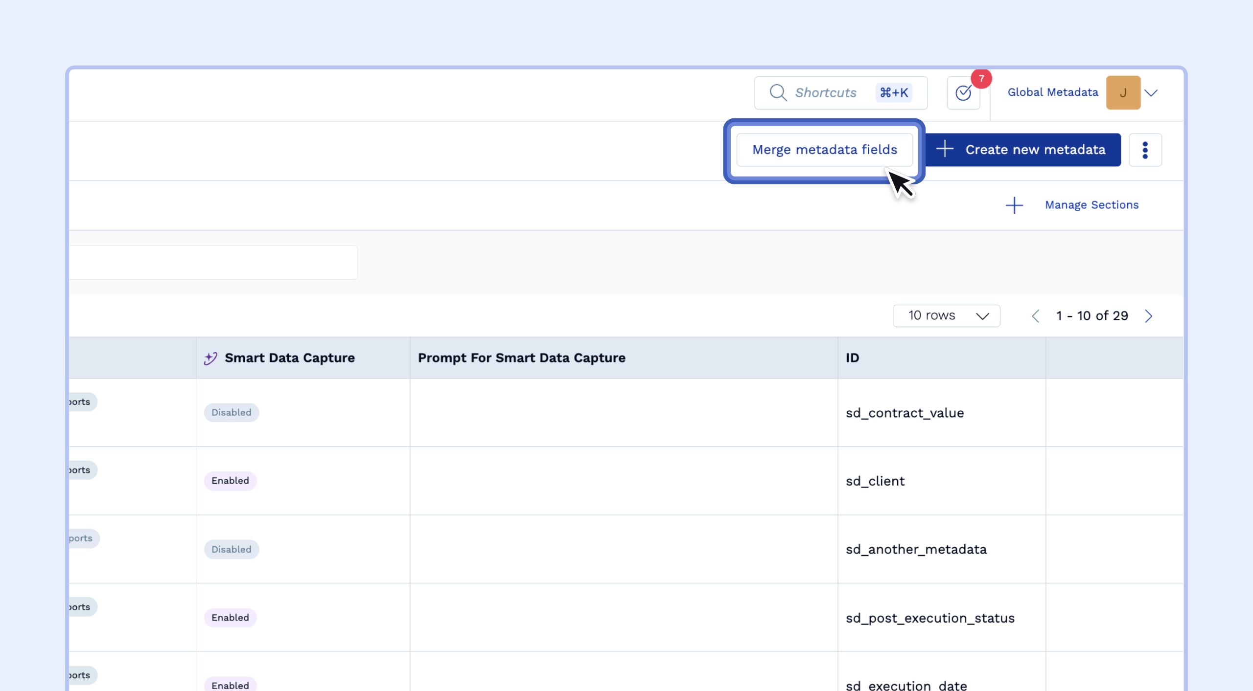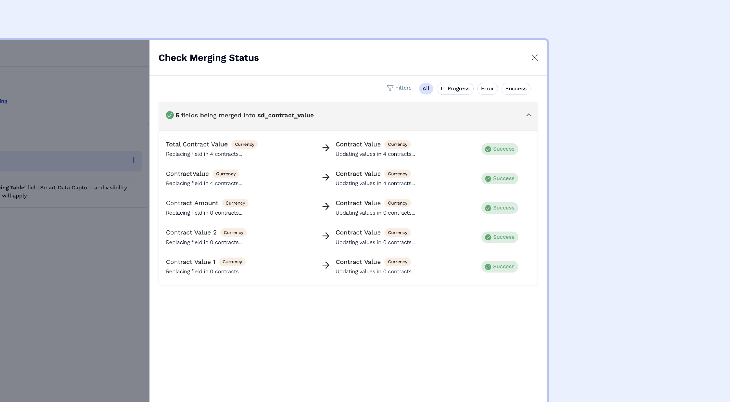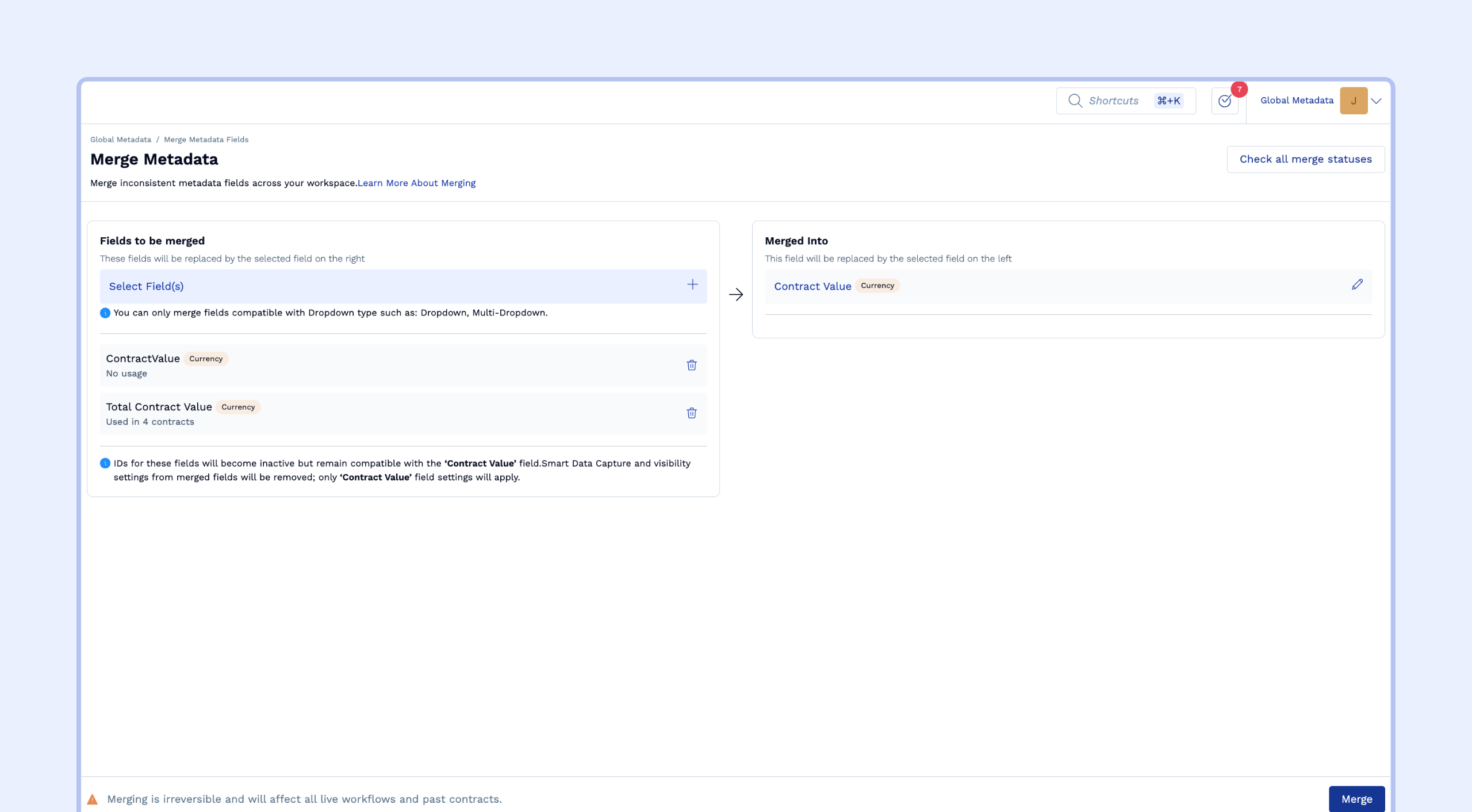 The Merge Metadata Fields feature helps you consolidate these duplicates into a single, reliable field used across all contracts.