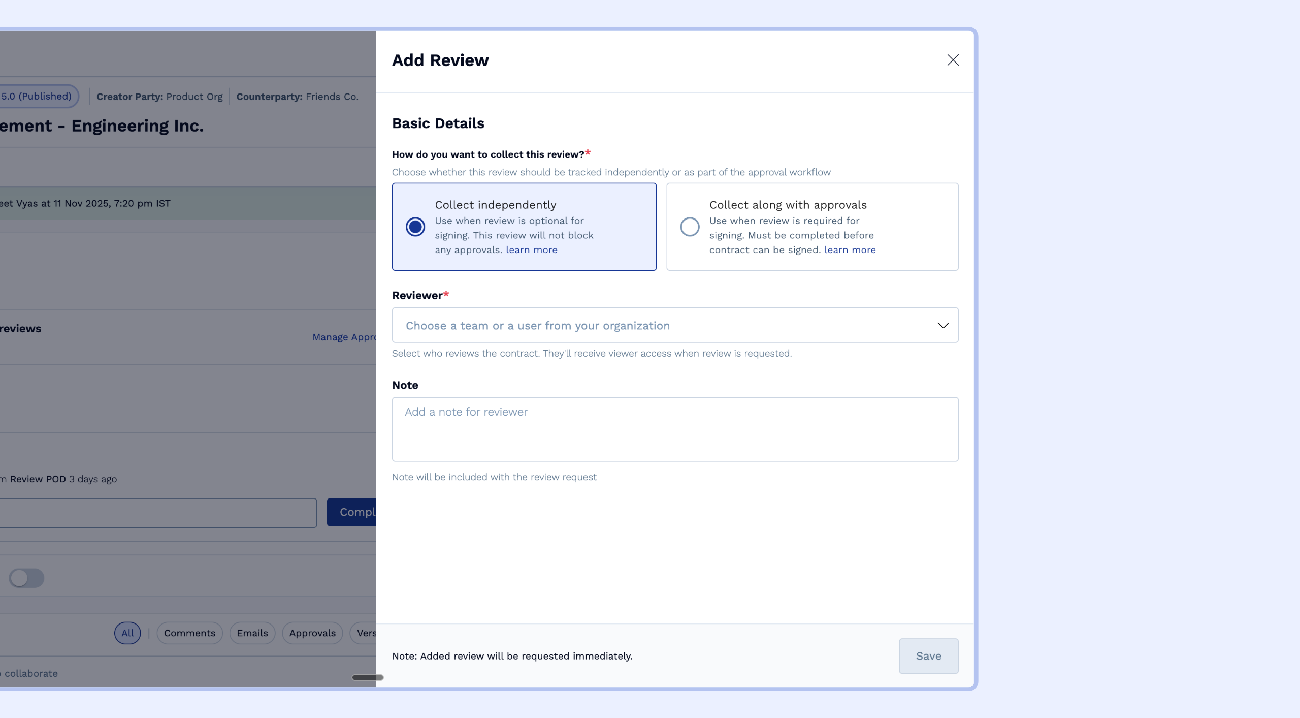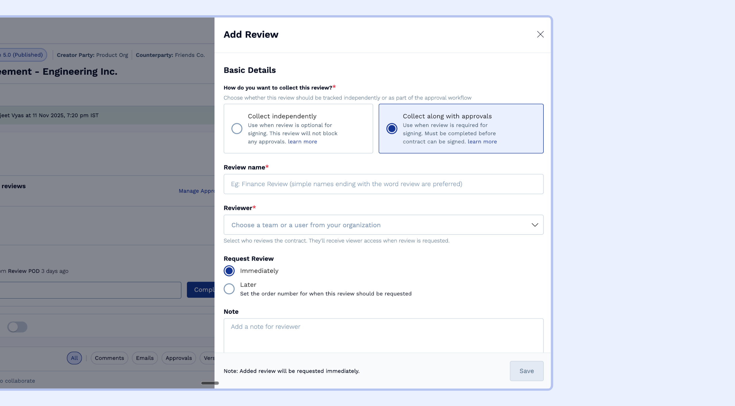Additionally, when collecting a review along with approvals, you can decide when the review should be collected (if at a later stage in the sequence) and if you want to block actions like download and send to counterparty until this review is completed.
