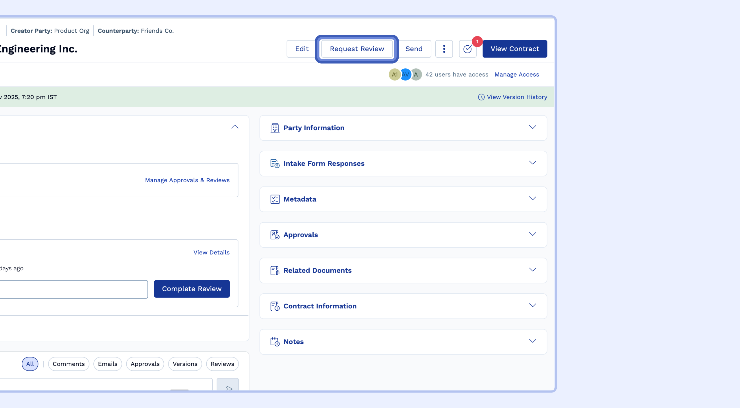 You can request a review manually from the contract details page. This is useful for contracts that don't follow a workflow or when you need last-minute ad-hoc feedback.