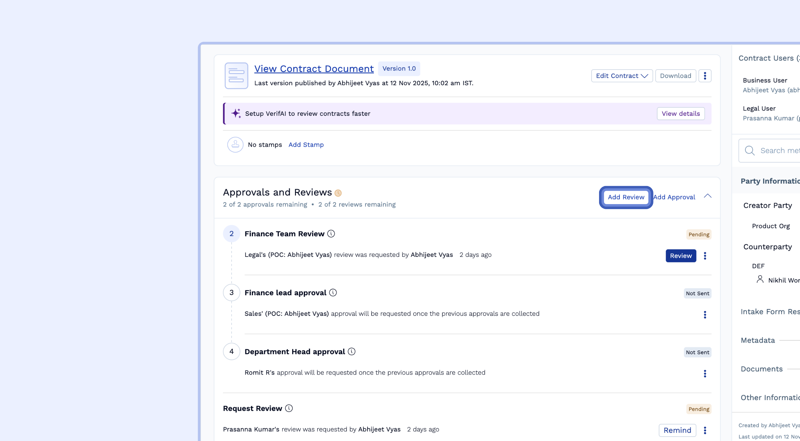 Access the Review Request: On the contract details page, click Request Review.