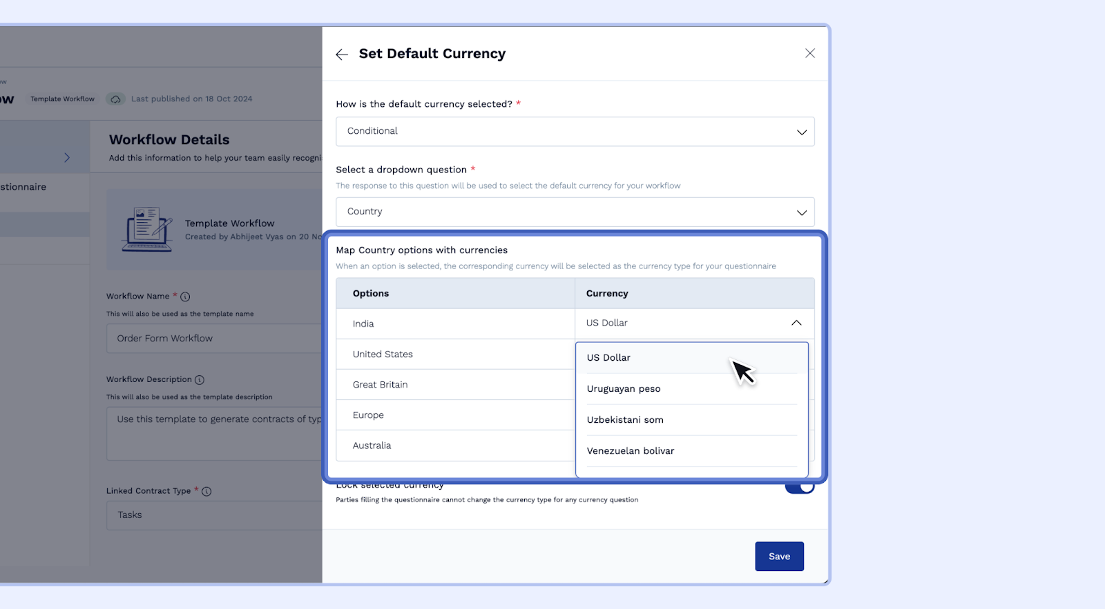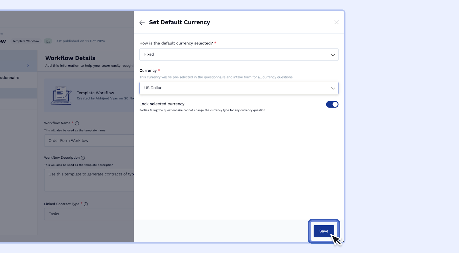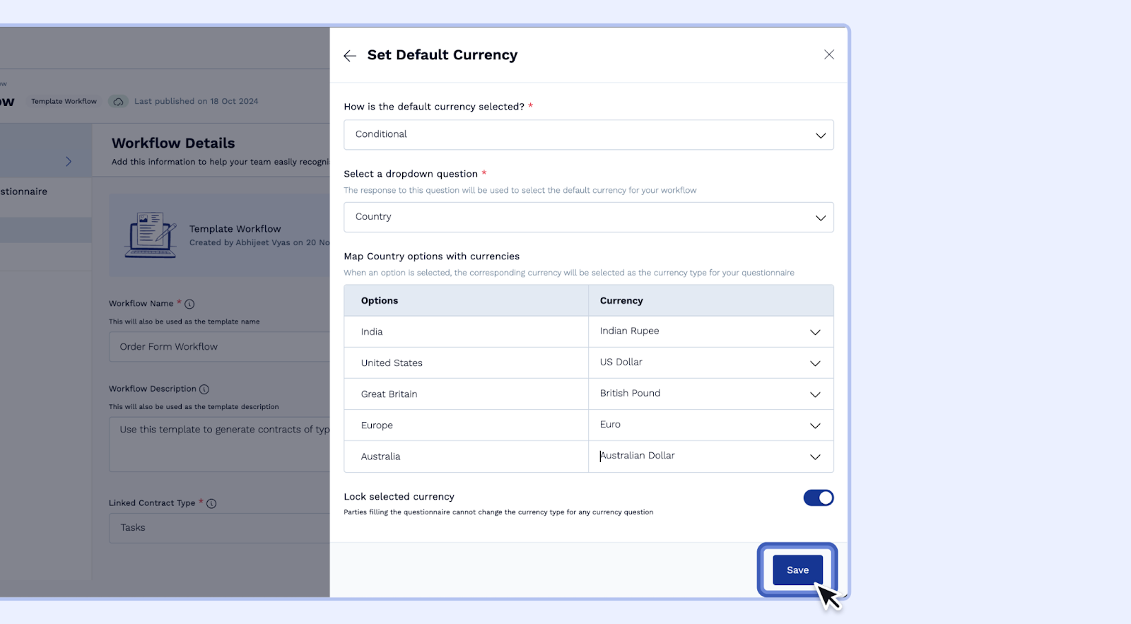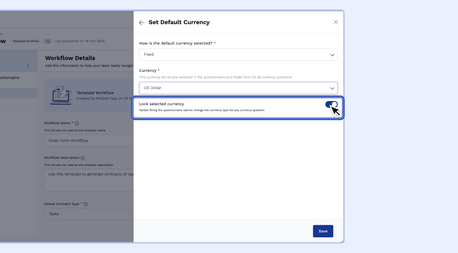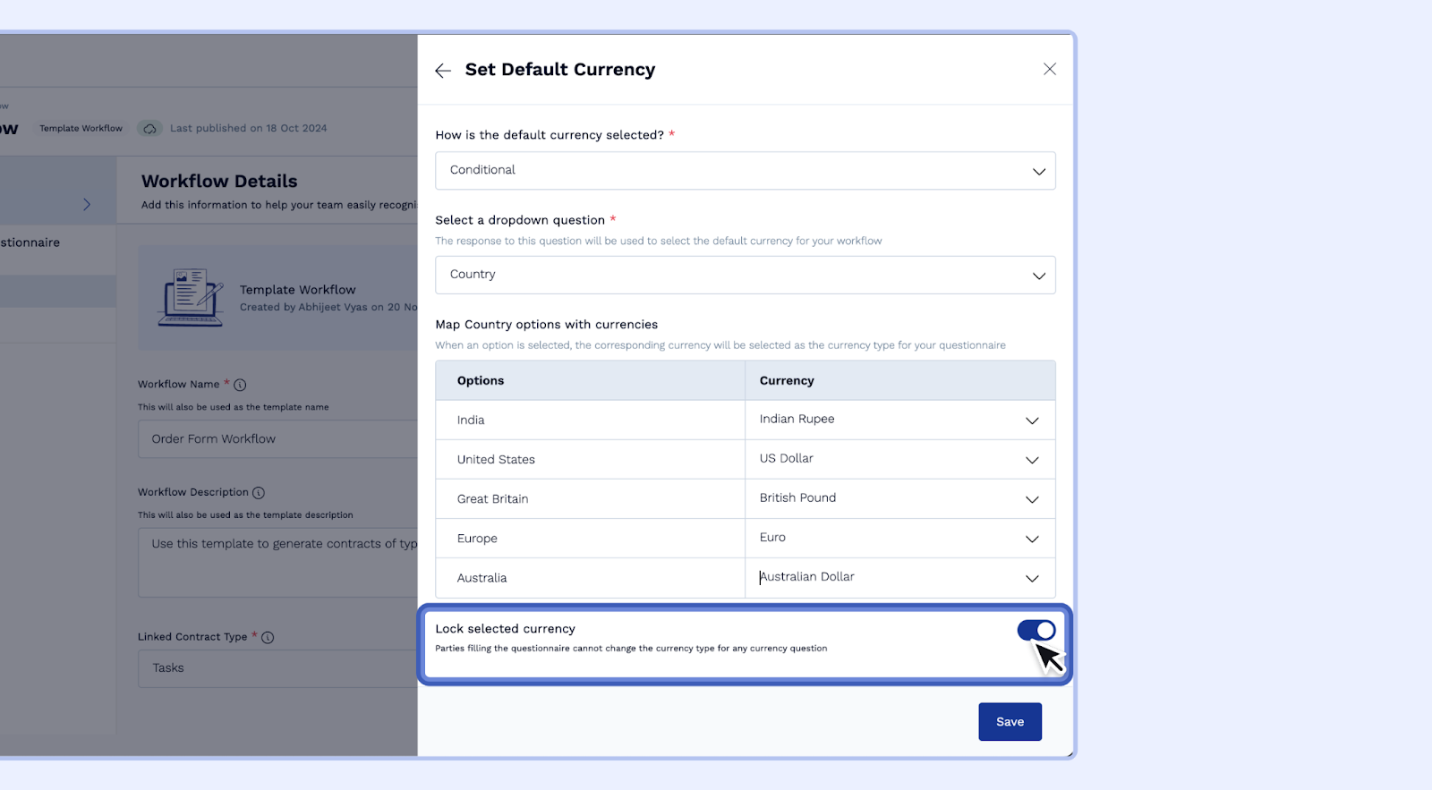 Lock the Selected Currency (Optional): If you want to prevent users from changing the default currency for currency questions while creating contracts, toggle the "Lock selected currency" switch to the ON position. Otherwise, leave it OFF.