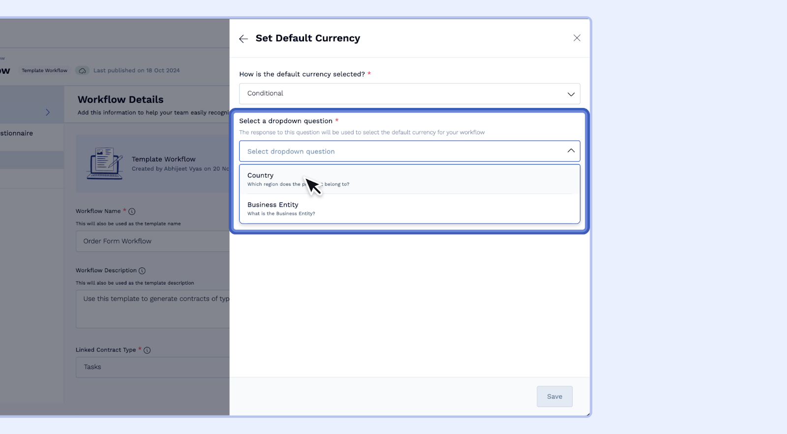 Choose a Dropdown Question: Select the dropdown question from your workflow that you want to base the default currency on.