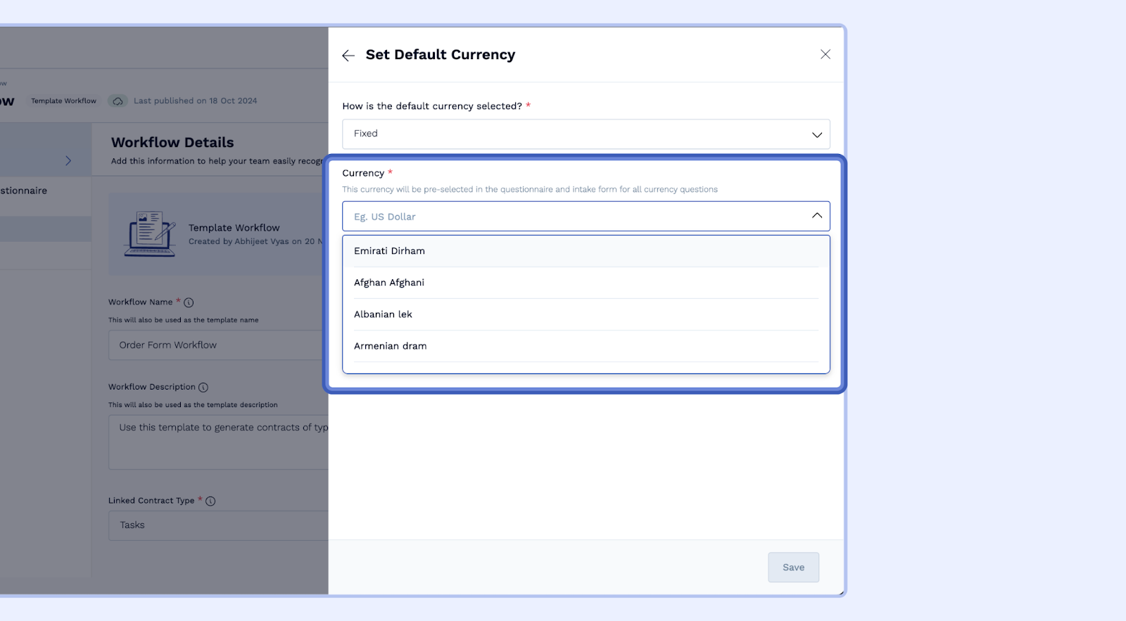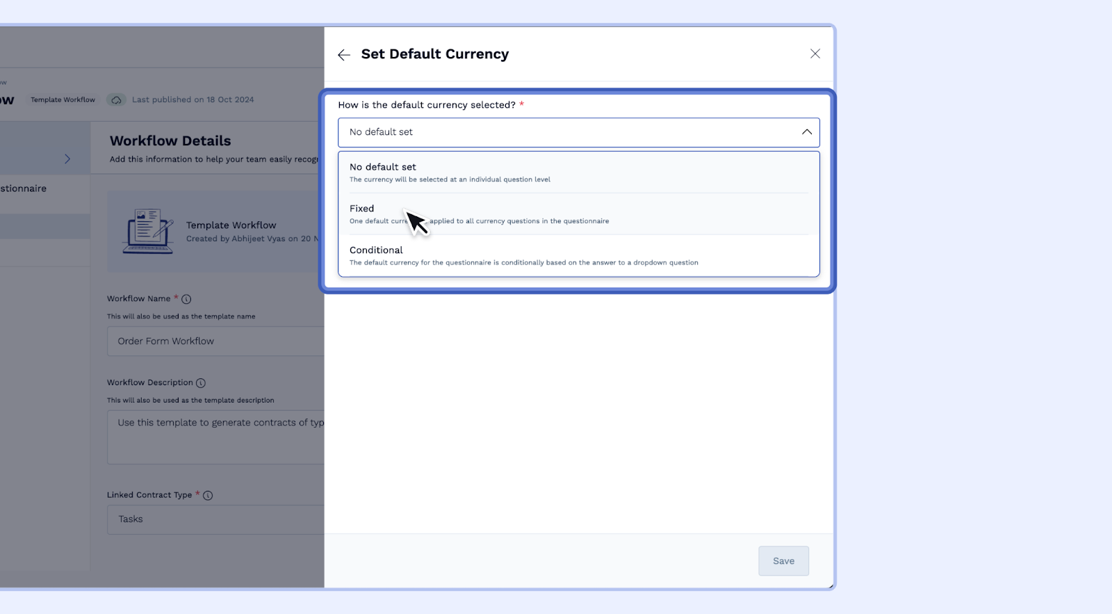 - Fixed Default Currency: Select a single currency that will apply to all currency questions within a specific workflow.