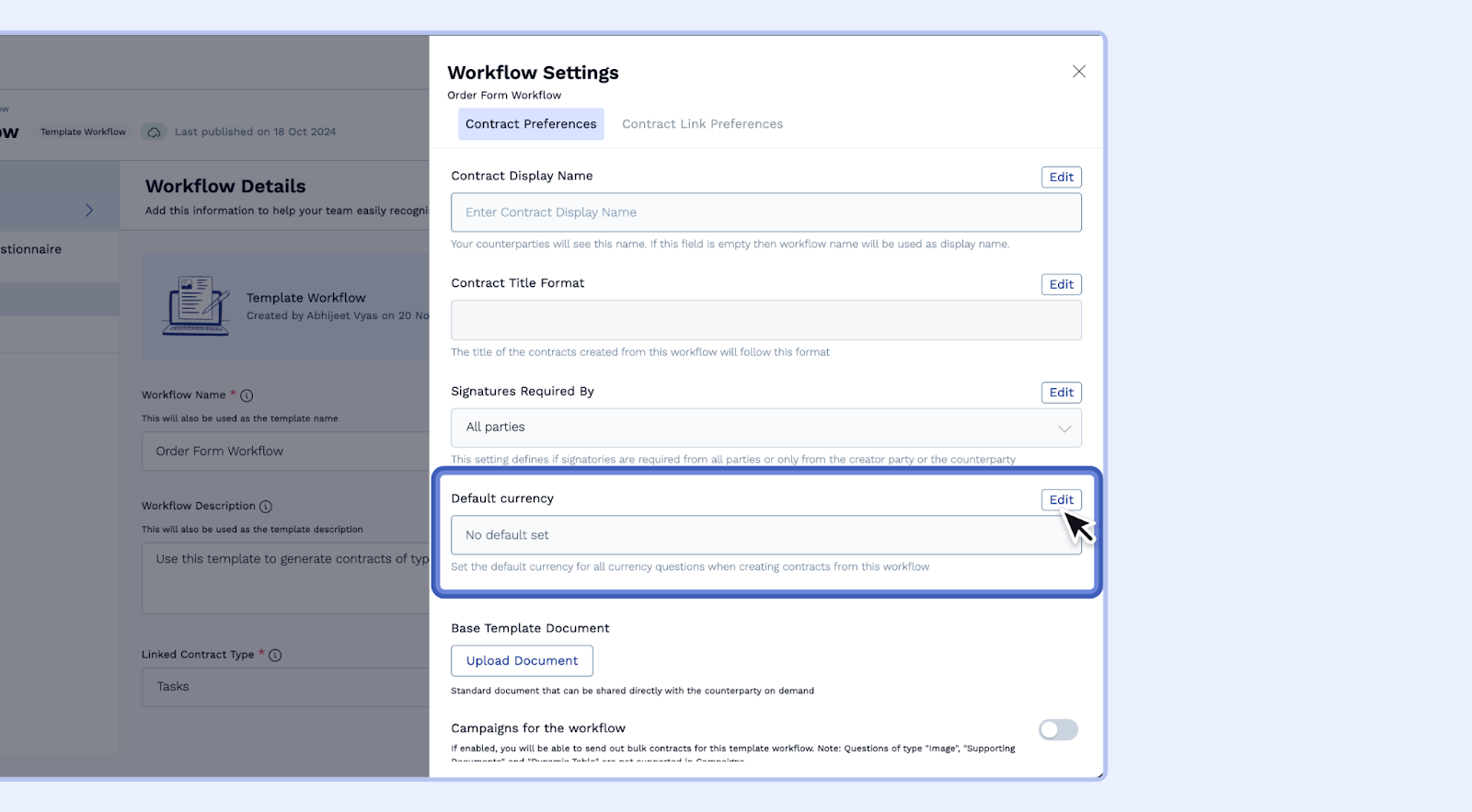 By setting default currencies in your SpotDraft workflows, you gain administrative control over the currencies used for your contracts and streamline the contract creation process. Choose the method that best fits your needs and ensure consistency across your team's workflow.