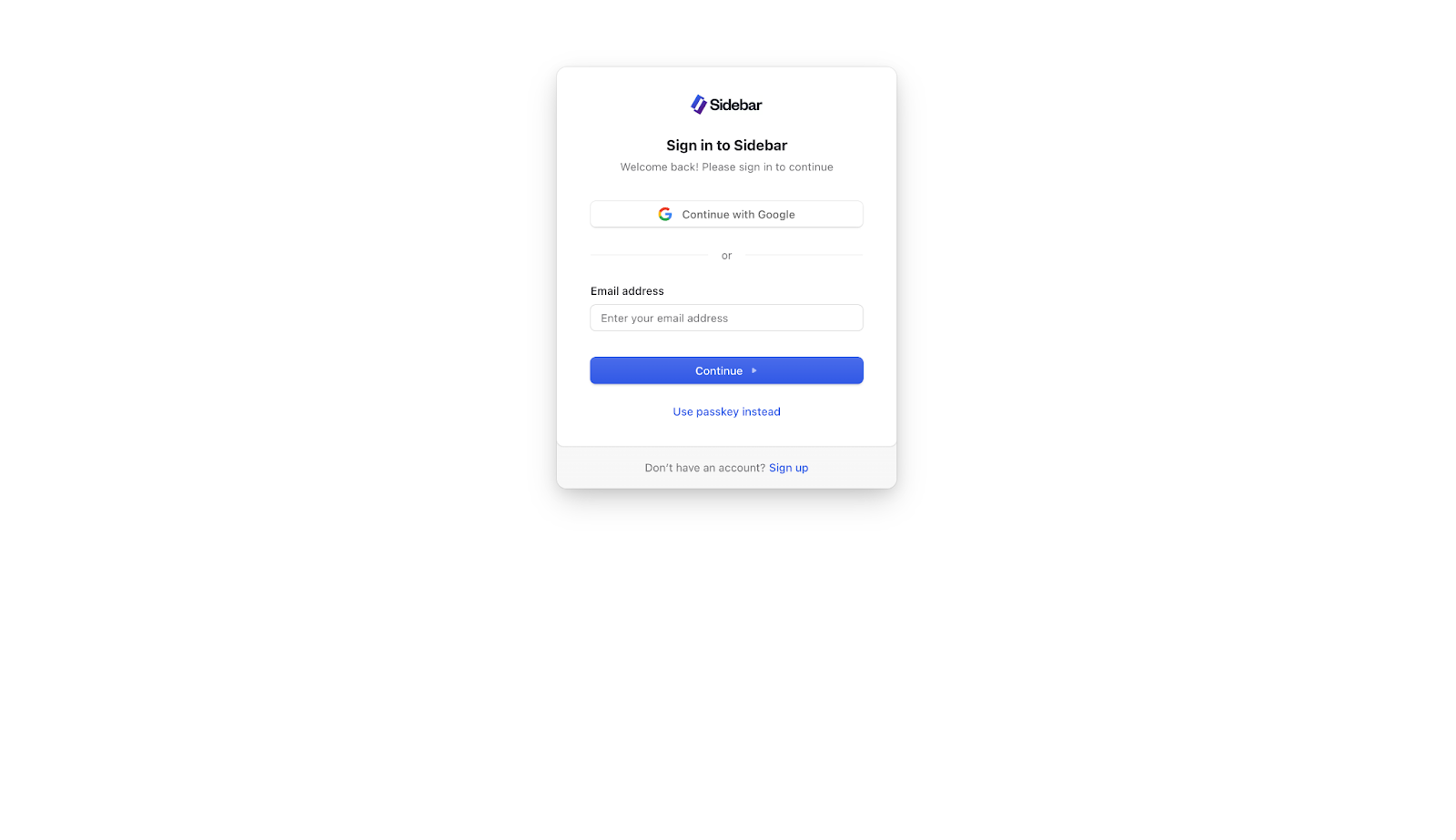 Sidebar will send a verification code to the email address you provided. Check your inbox, enter the 6-digit code on the "Verify your email" screen, and click Continue.