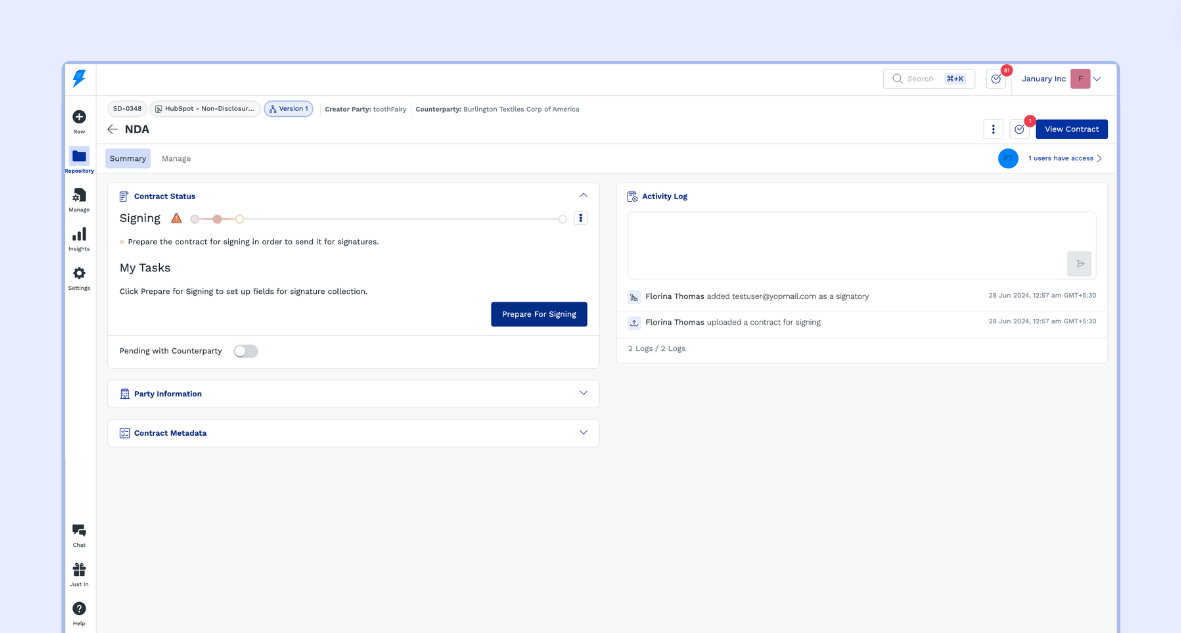 - Comprehensive Contract Information in Notifications: Notifications include essential details such as the contract name, the SpotDraft user who created it, counterparty name, a direct link to the contract, and any notes or tags for the signatory. This comprehensive information aids in quick decision-making and efficient management.