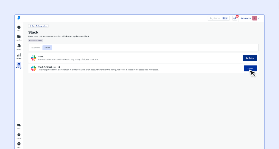 This integration lets you send customizable contract notifications to specific Slack channels based on selected events and contract types.