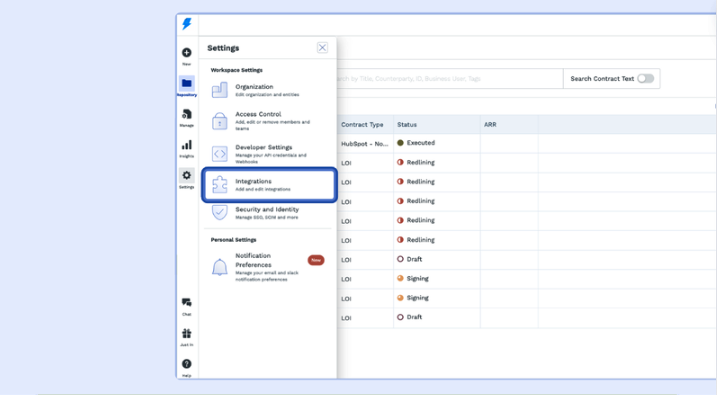 1.1 - Login to your SpotDraft workspace and navigate to Settings → Integrations.