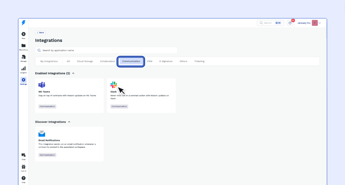 - Ensure the "Slack" integration is enabled in your SpotDraft workspace.