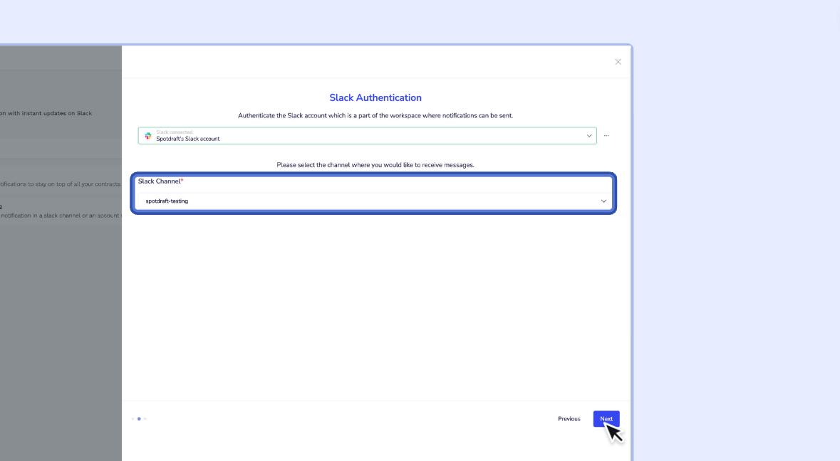 - Choose the Slack channel to receive SpotDraft notifications