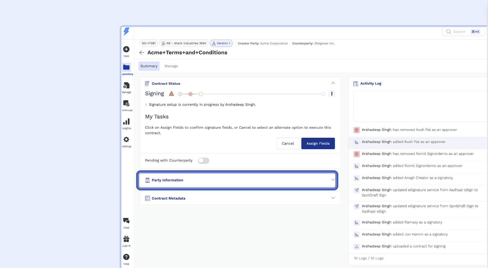 Signatories: These are the individuals who will digitally sign the contract. They are legally bound by the contract once they sign it. You can add multiple signatories from within an organization, but for individual parties, you can't add or modify signatories. However, counterparty signatories (excluding individual-type counterparties) can reassign themselves during the signing process.