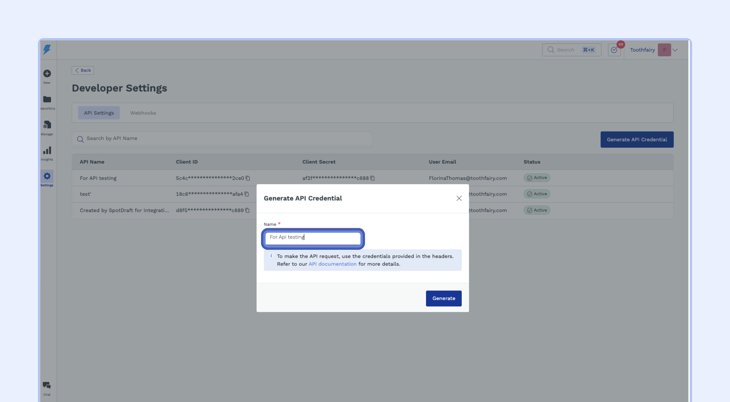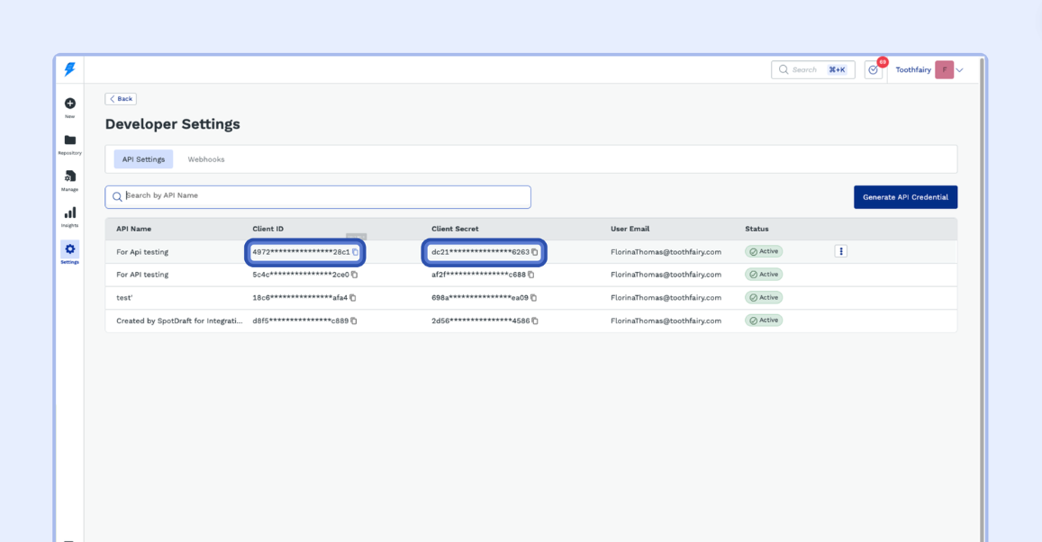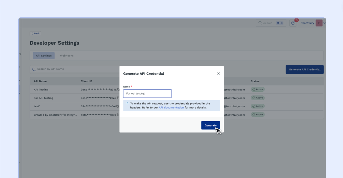 SpotDraft API credentials are essential for authenticating requests made to SpotDraft's Public APIs. Here's how to generate API credentials: