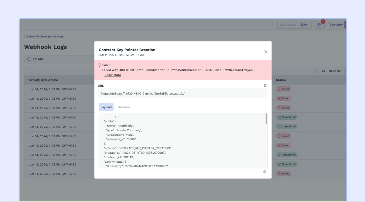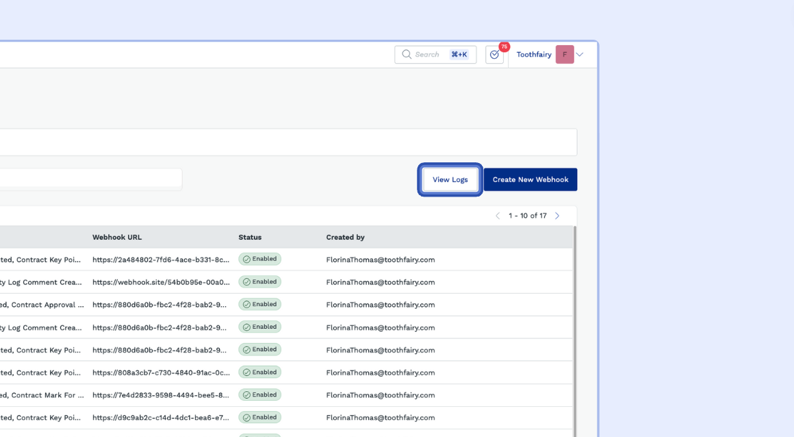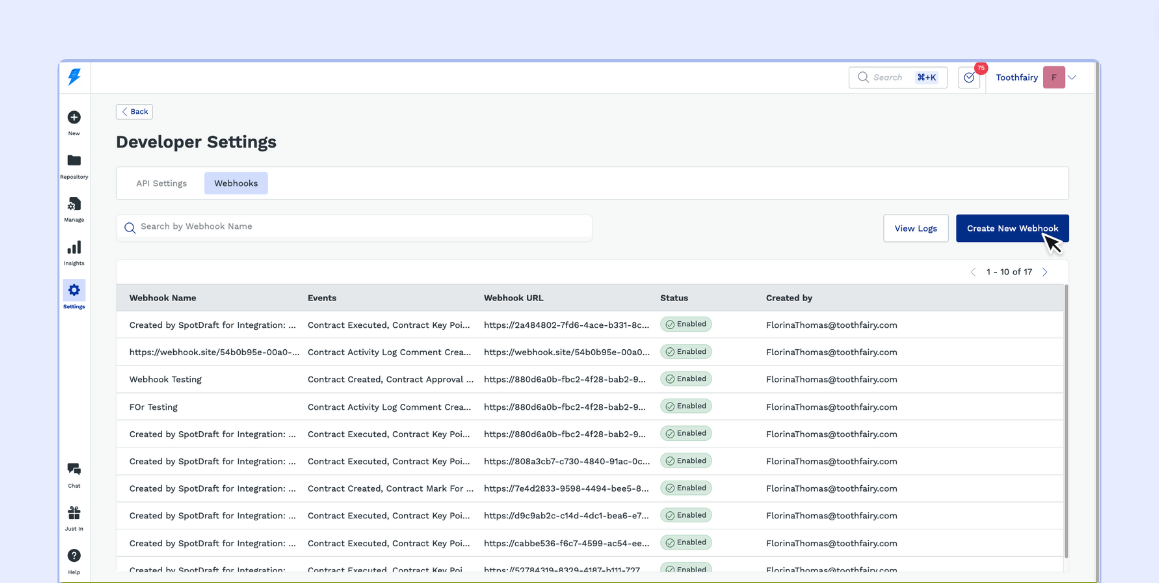- Navigate to Webhook Logs: In your SpotDraft account, locate the option to view webhook logs, usually found within the Webhooks section or under Developer Settings.