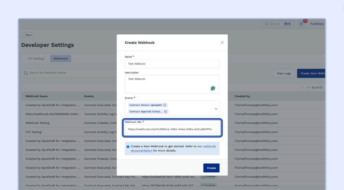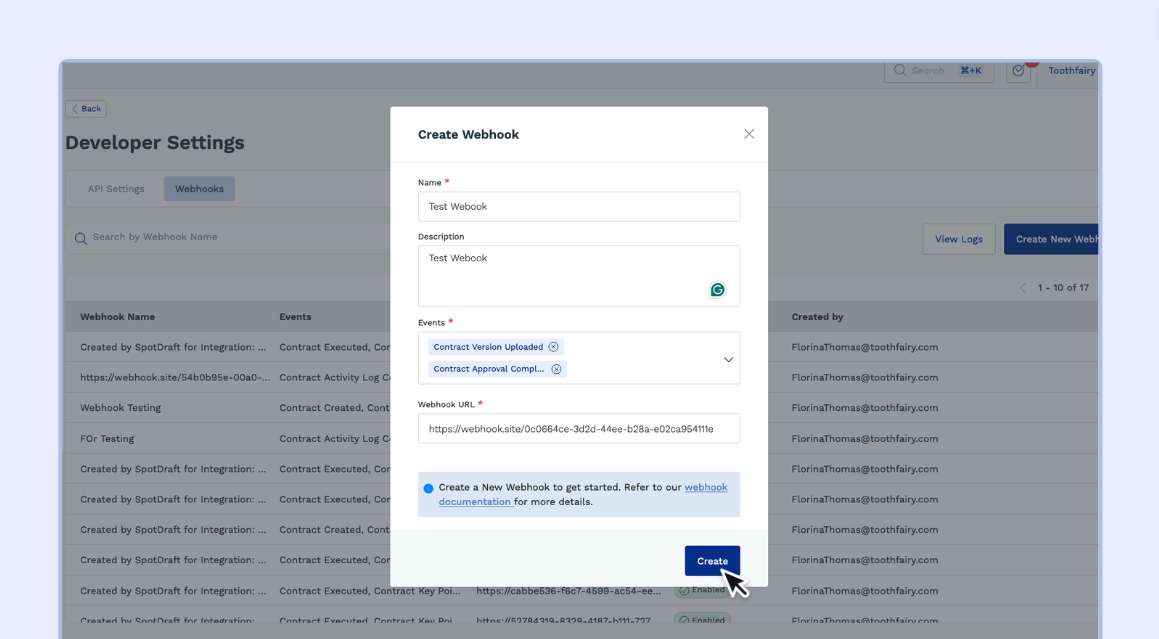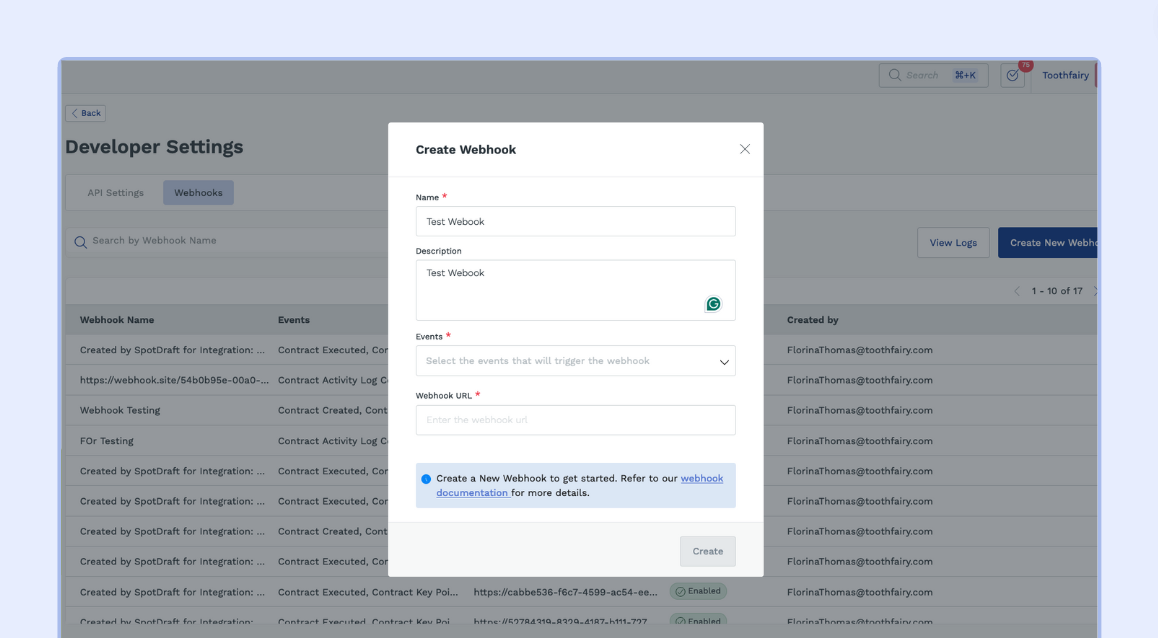 SpotDraft offers robust API functionalities and webhook integration capabilities, empowering users to streamline their workflows and enhance automation. This comprehensive guide aims to provide step-by-step instructions for configuring SpotDraft API credentials, setting up webhooks, and accessing webhook logs. For further details on SpotDraft's API and webhook features, refer to the SpotDraft Public API Documentation.