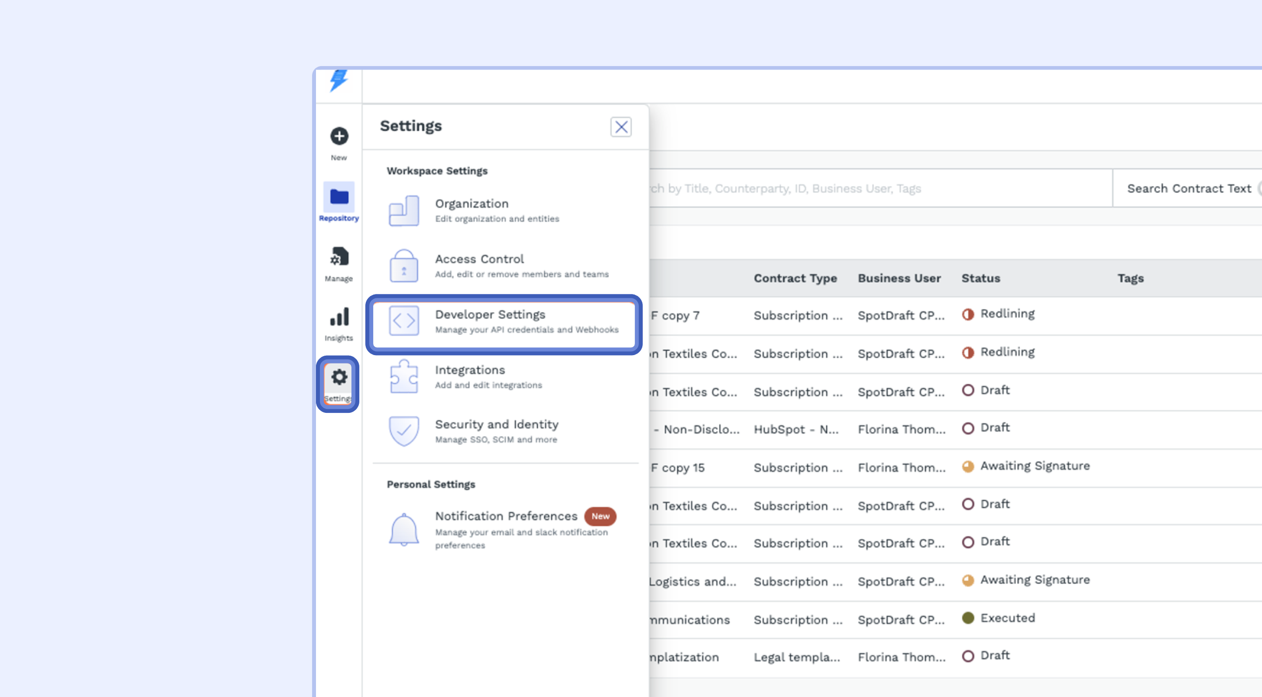 - Access Webhooks Section: Within your SpotDraft account, navigate to the "Webhooks" section, found within the Developer Settings.