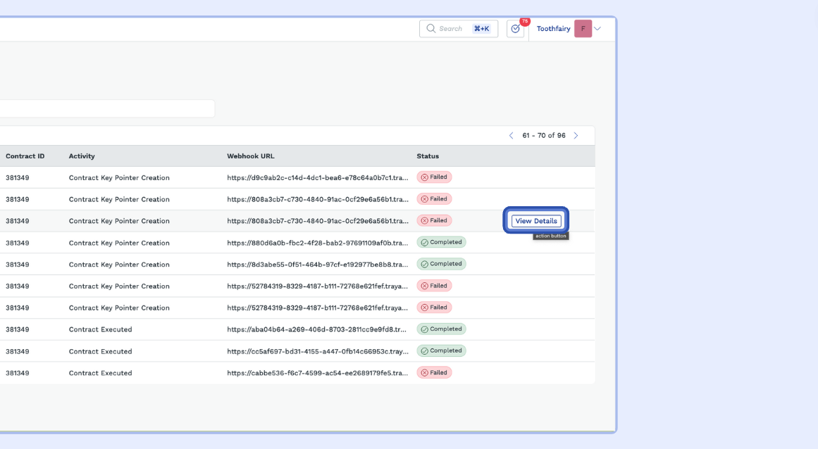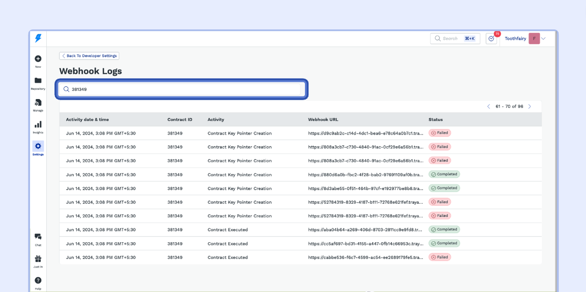 - Search by Contract Id: If needed, search for specific webhook logs by contract ID to narrow down the results.