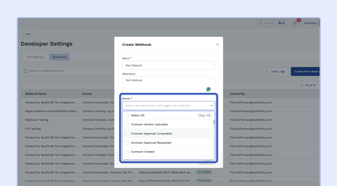 Webhooks enable SpotDraft to send real-time notifications to your application when specific events occur. Follow these steps to set up webhooks:
