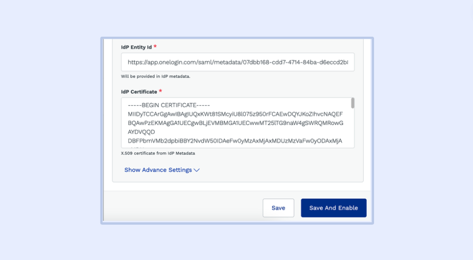 • Paste the values from ‘Step 3’ into the IdP Certificate section at the bottom.