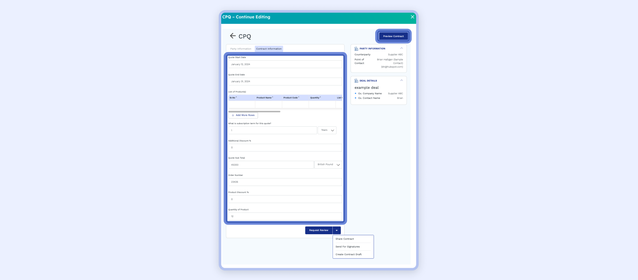 - Incorporate Data from Quotes: Automatically include data from related quotes into contract drafts for comprehensive and accurate documentation.