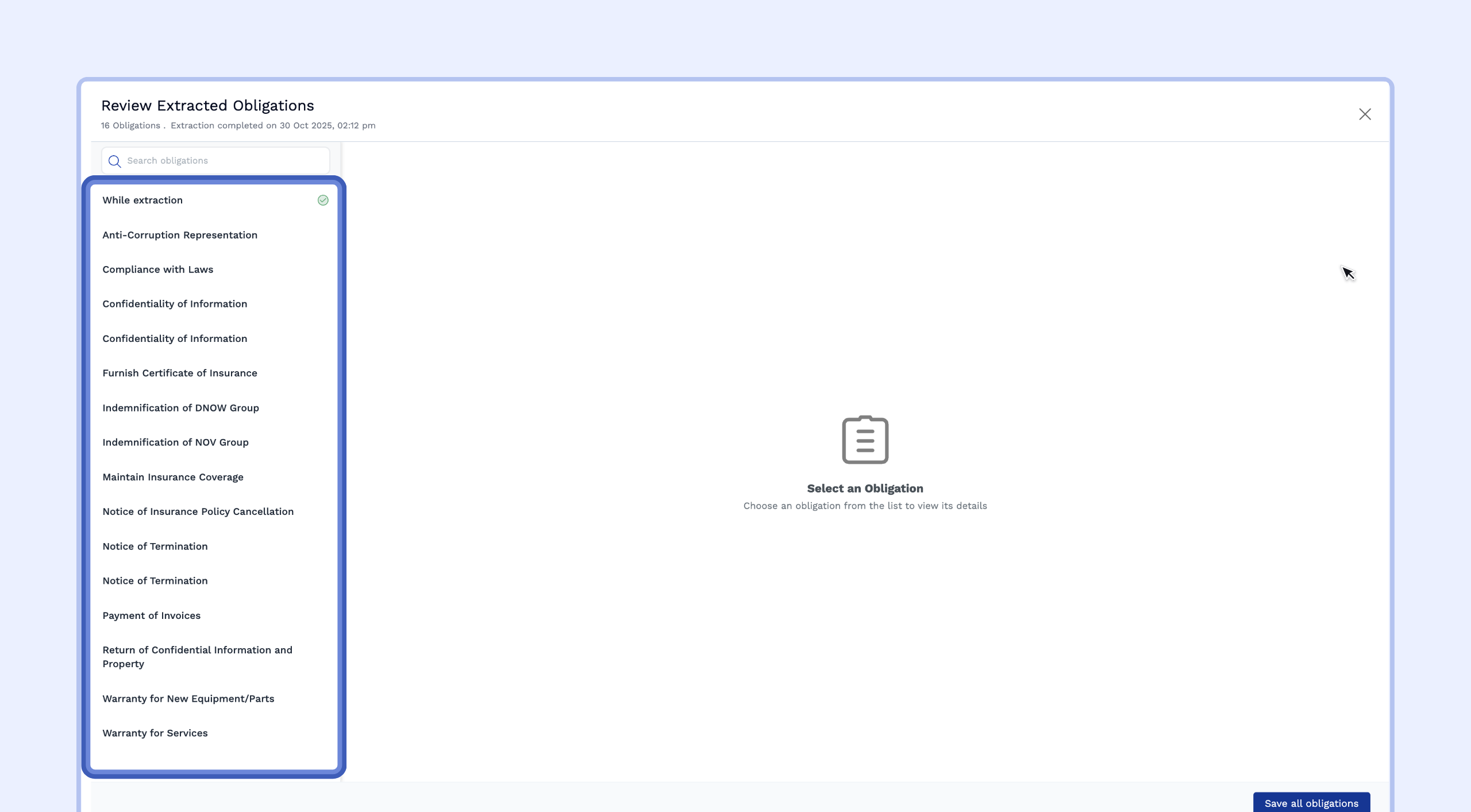 Once finished, you will see a notification indicating how many obligations were found (e.g., "3 Obligations were extracted").