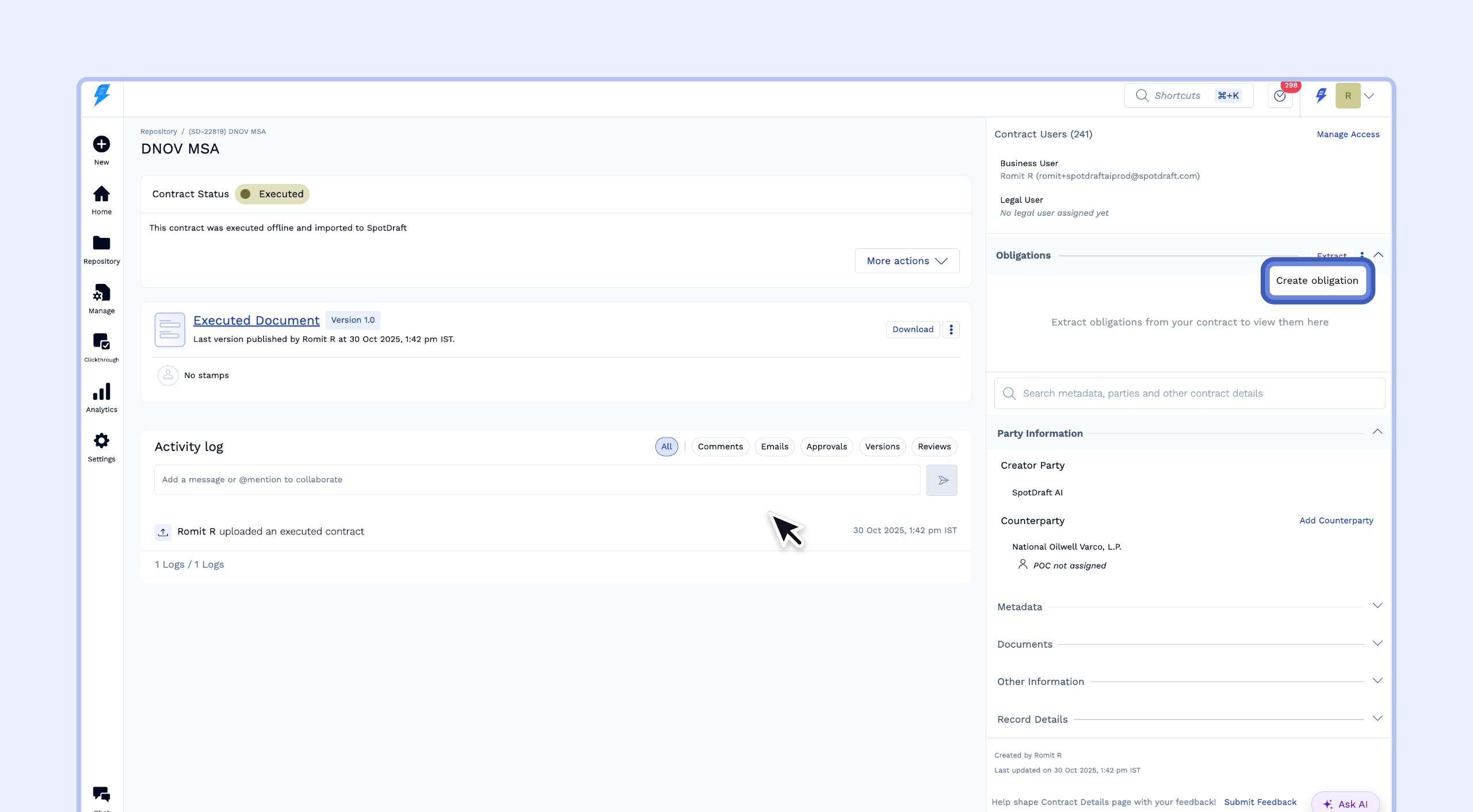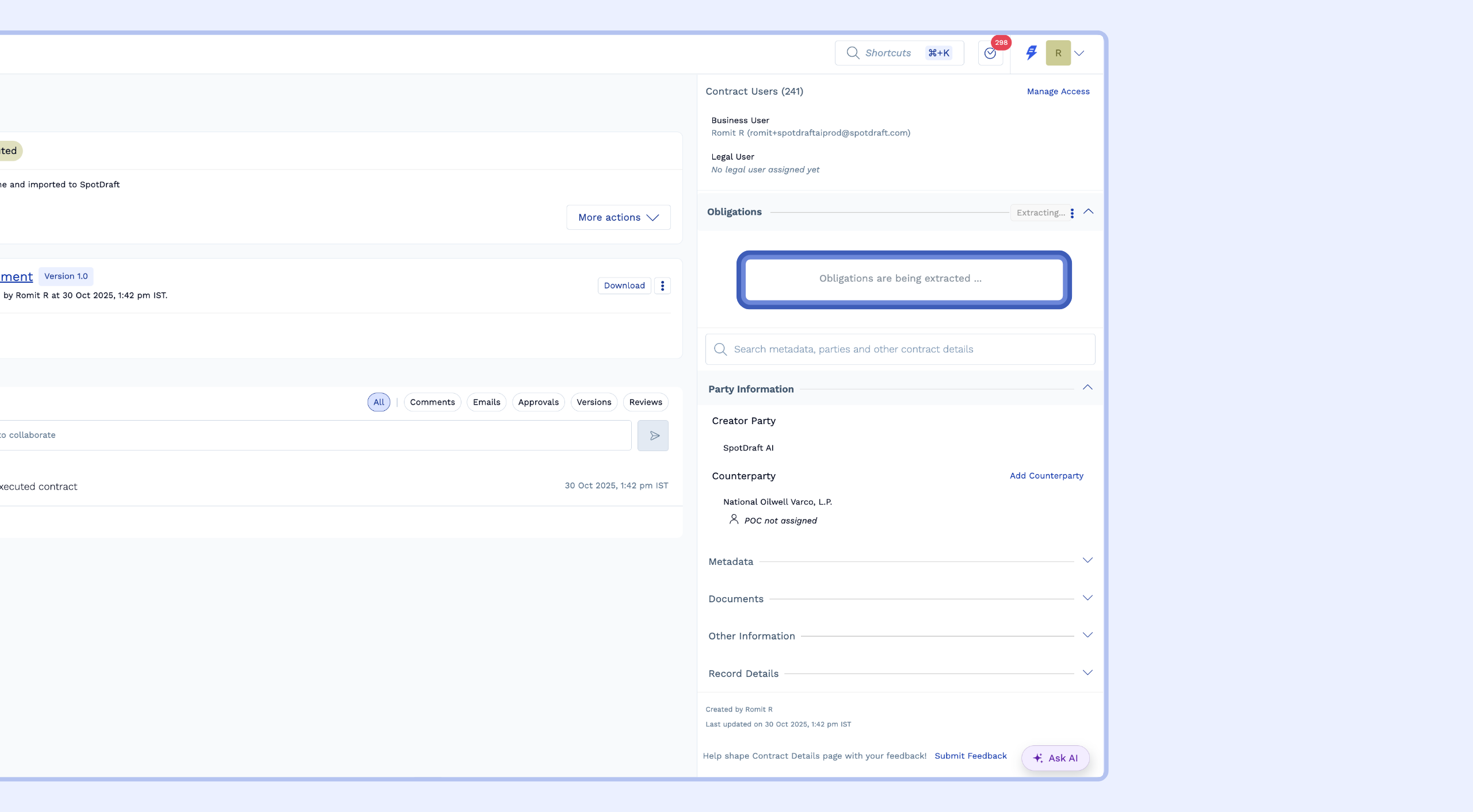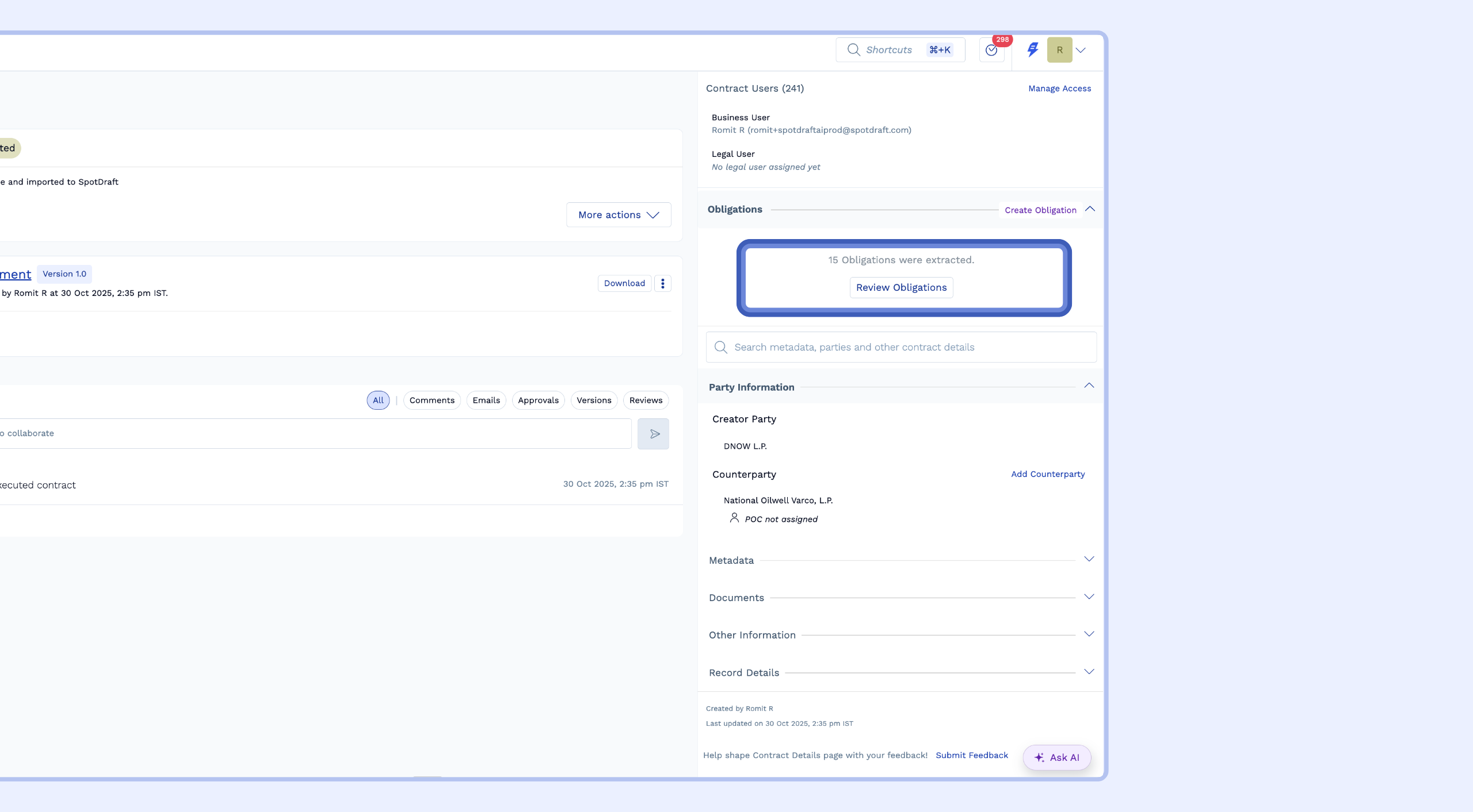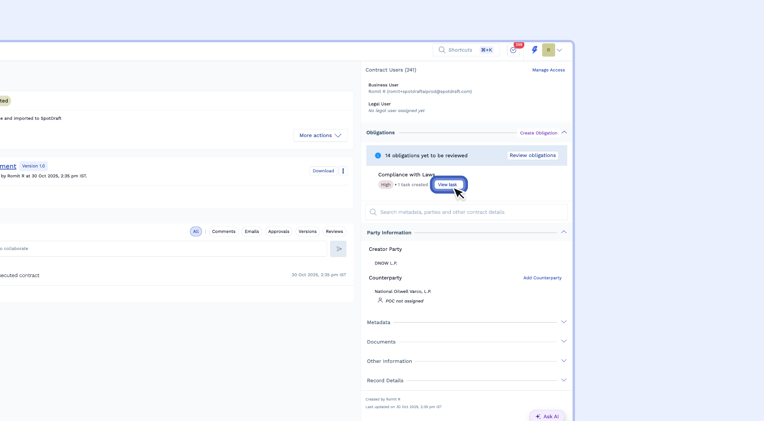 You can use SpotDraft’s AI to automatically scan your executed contracts and extract these obligations, or you can create them manually. This guide will walk you through extracting obligations using AI and converting them into trackable tasks for your team.