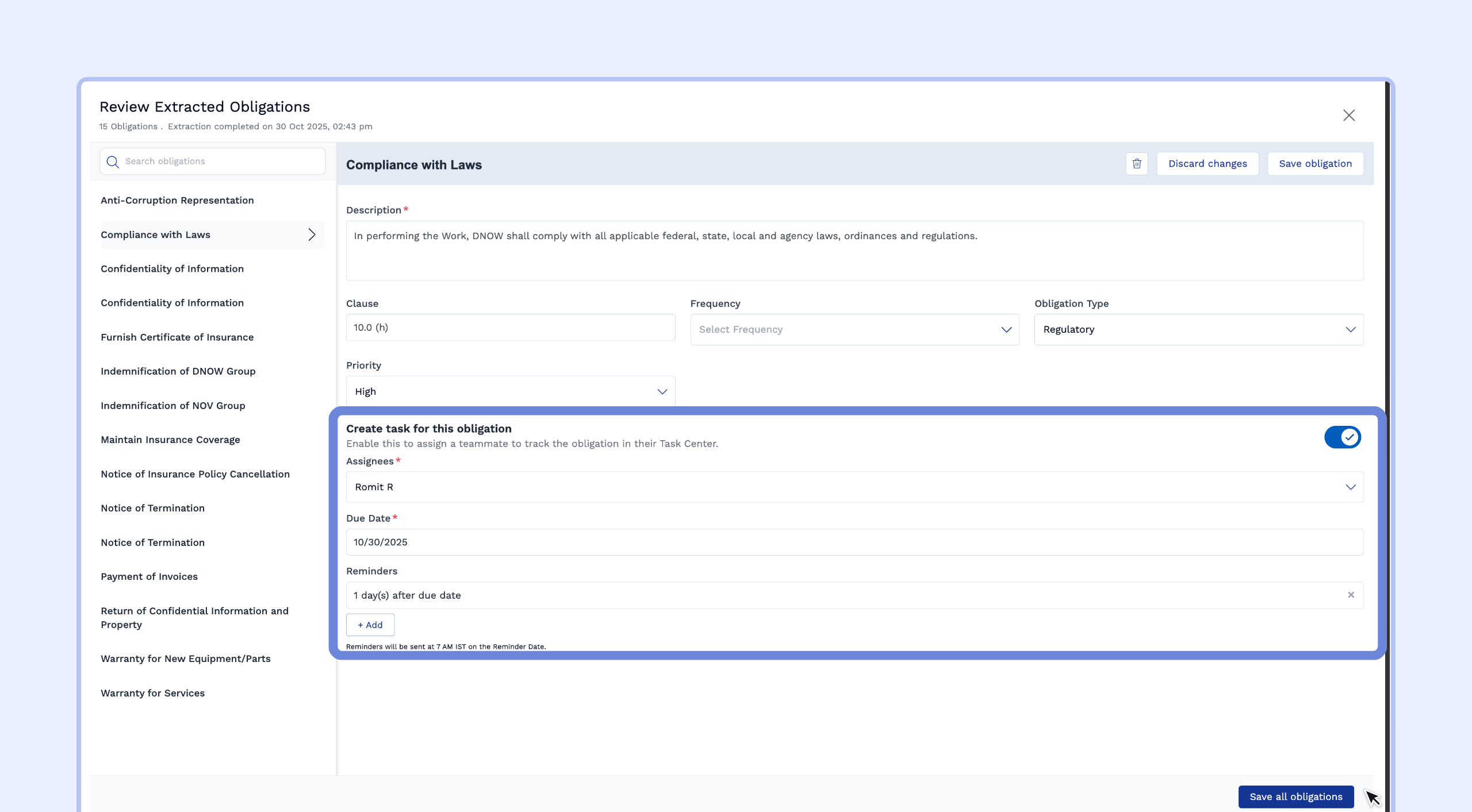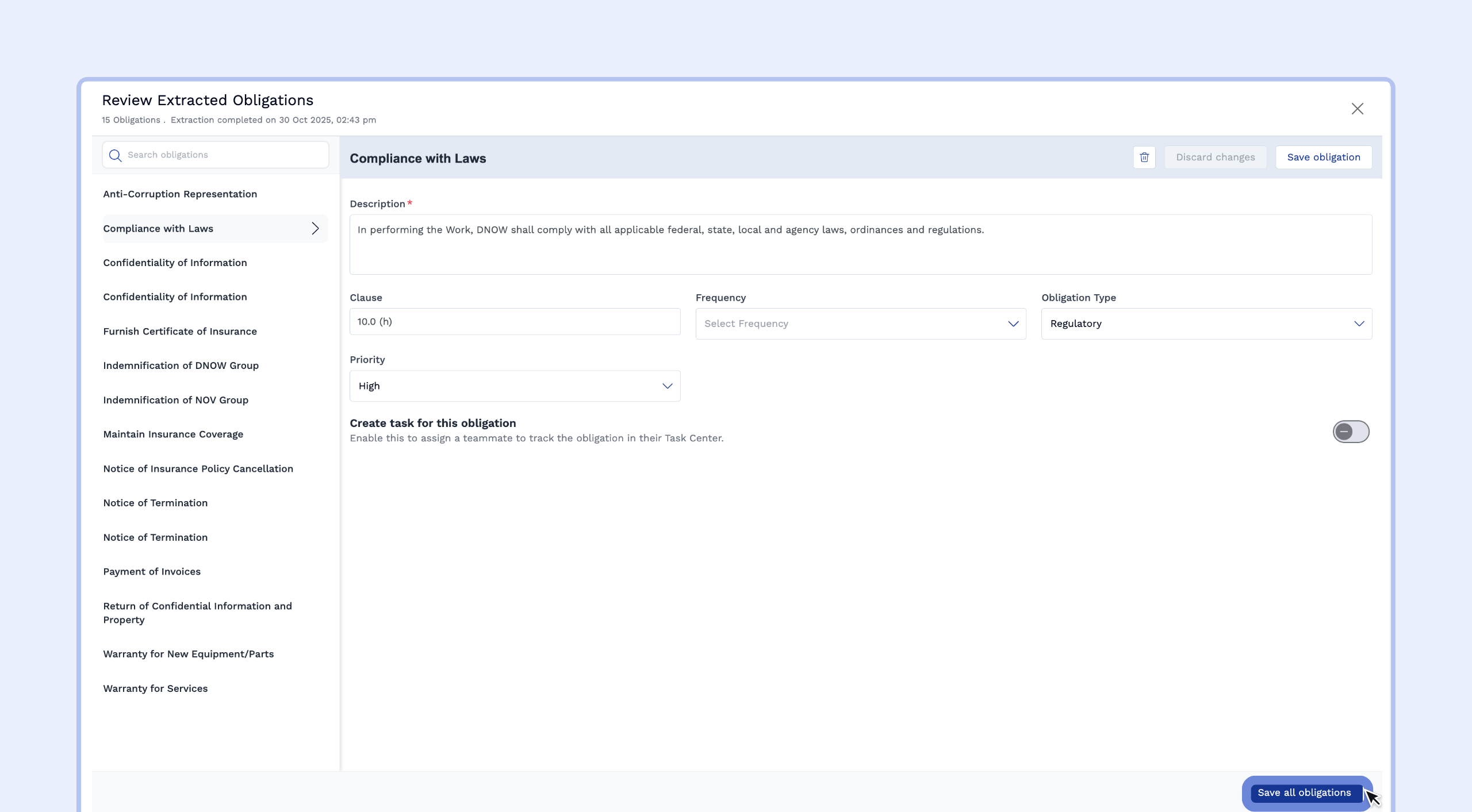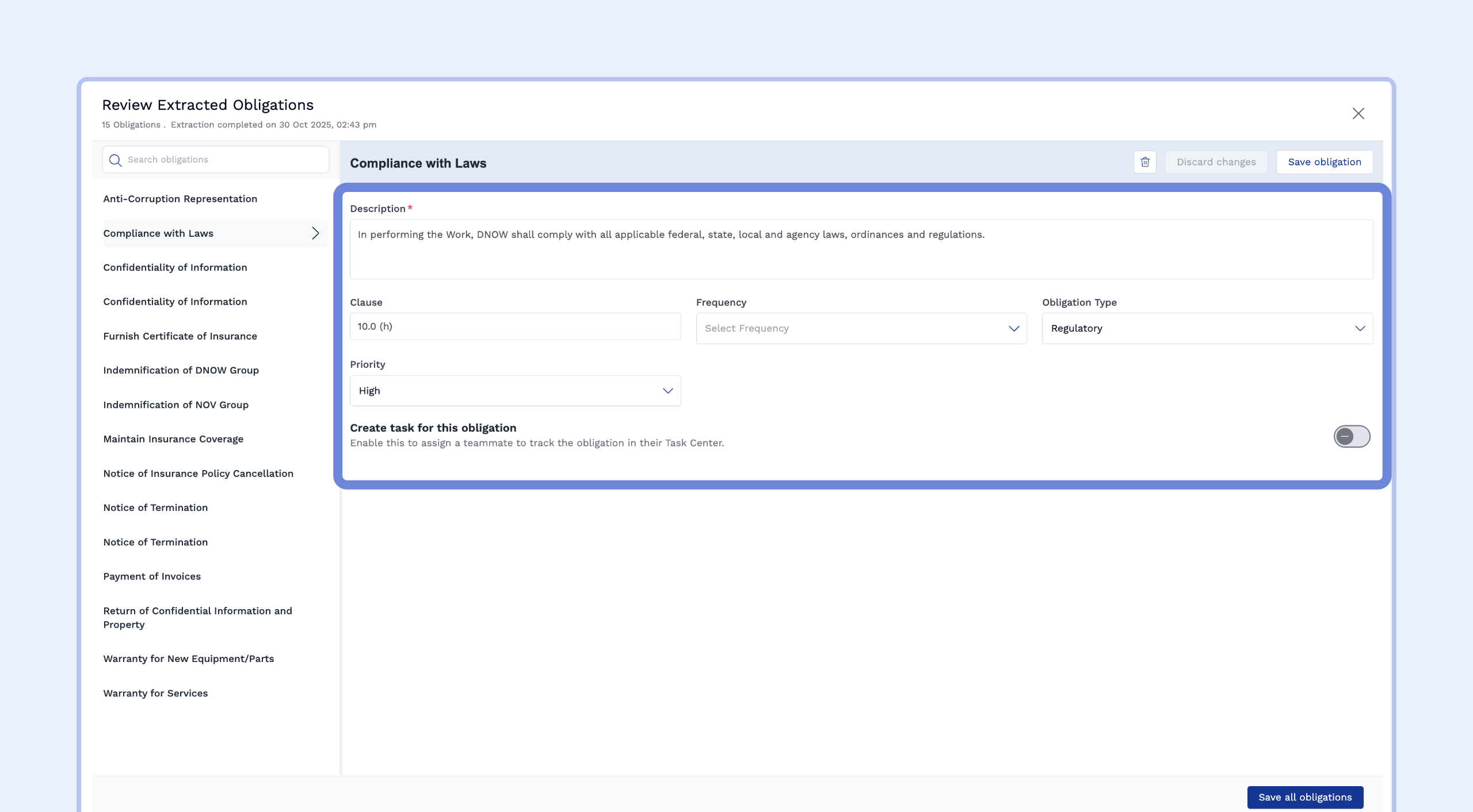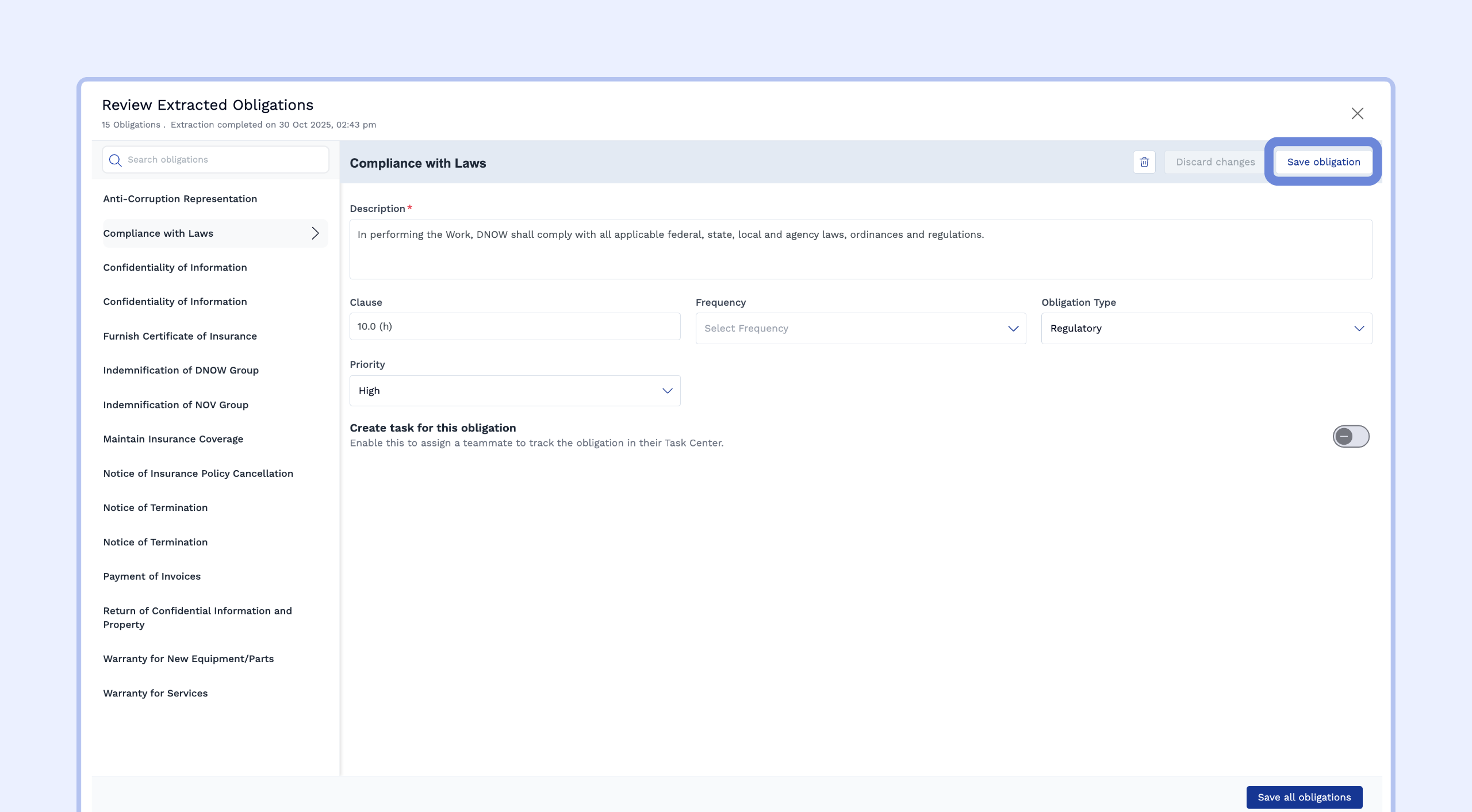 In the review window, you will see a list of extracted obligations on the left (e.g., Notice of Breach, Insurance Cancellation).