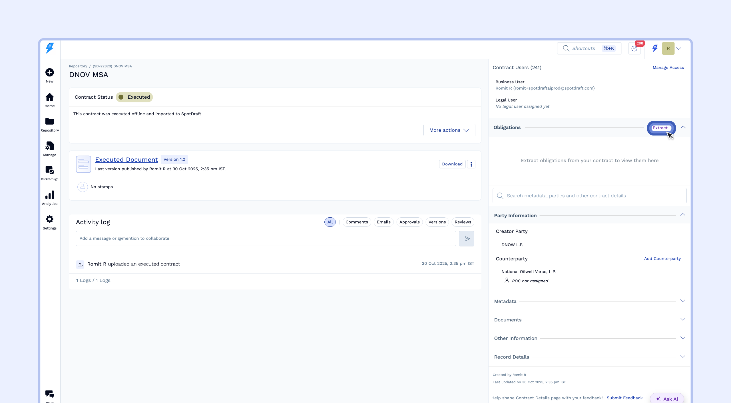 Obligation Management is designed for contracts that are finalized. Ensure your contract is in the Executed status on SpotDraft before attempting to extract obligations. This ensures you are working with the final, agreed-upon terms.