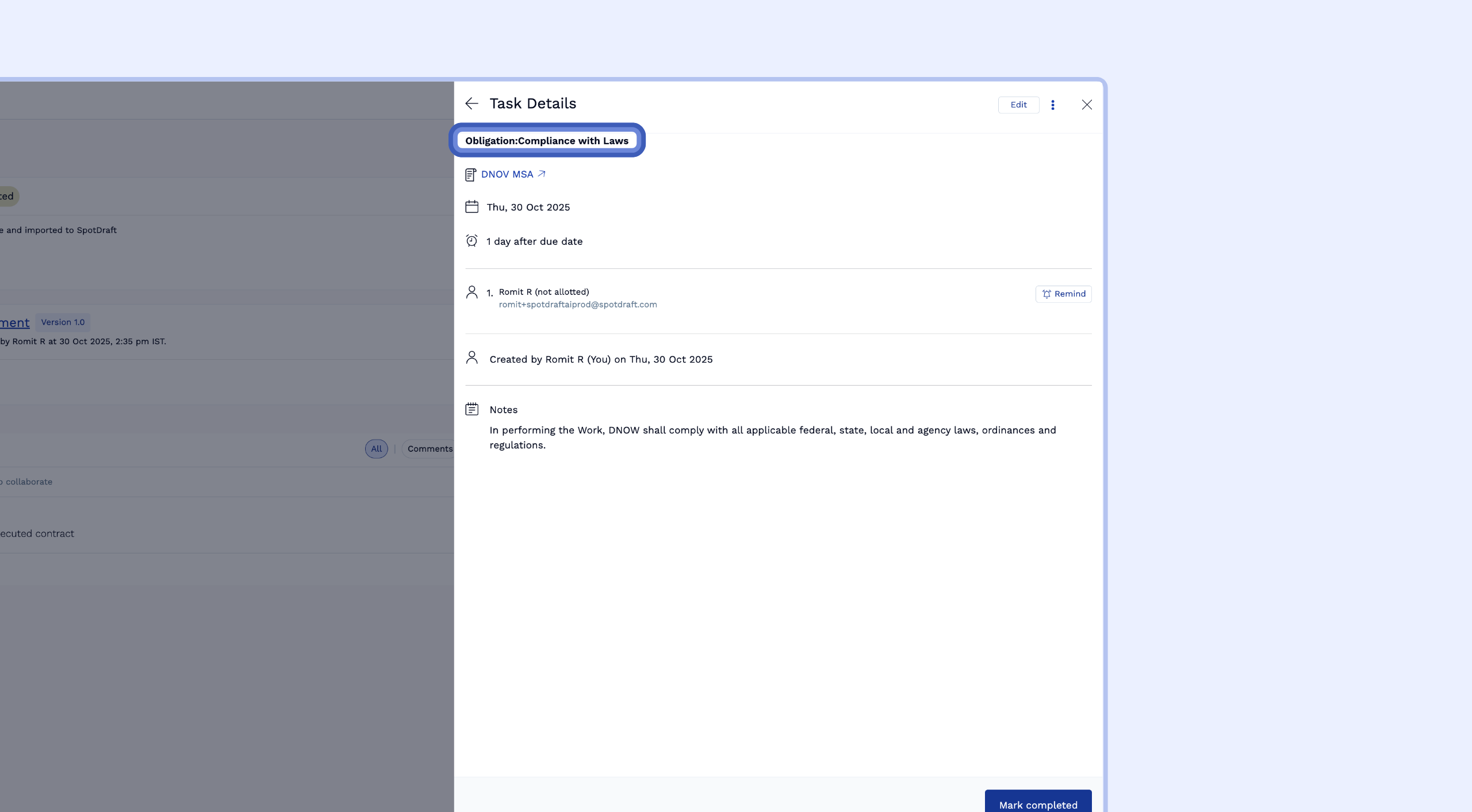 To ensure an obligation is actioned, you can convert it into a SpotDraft task.