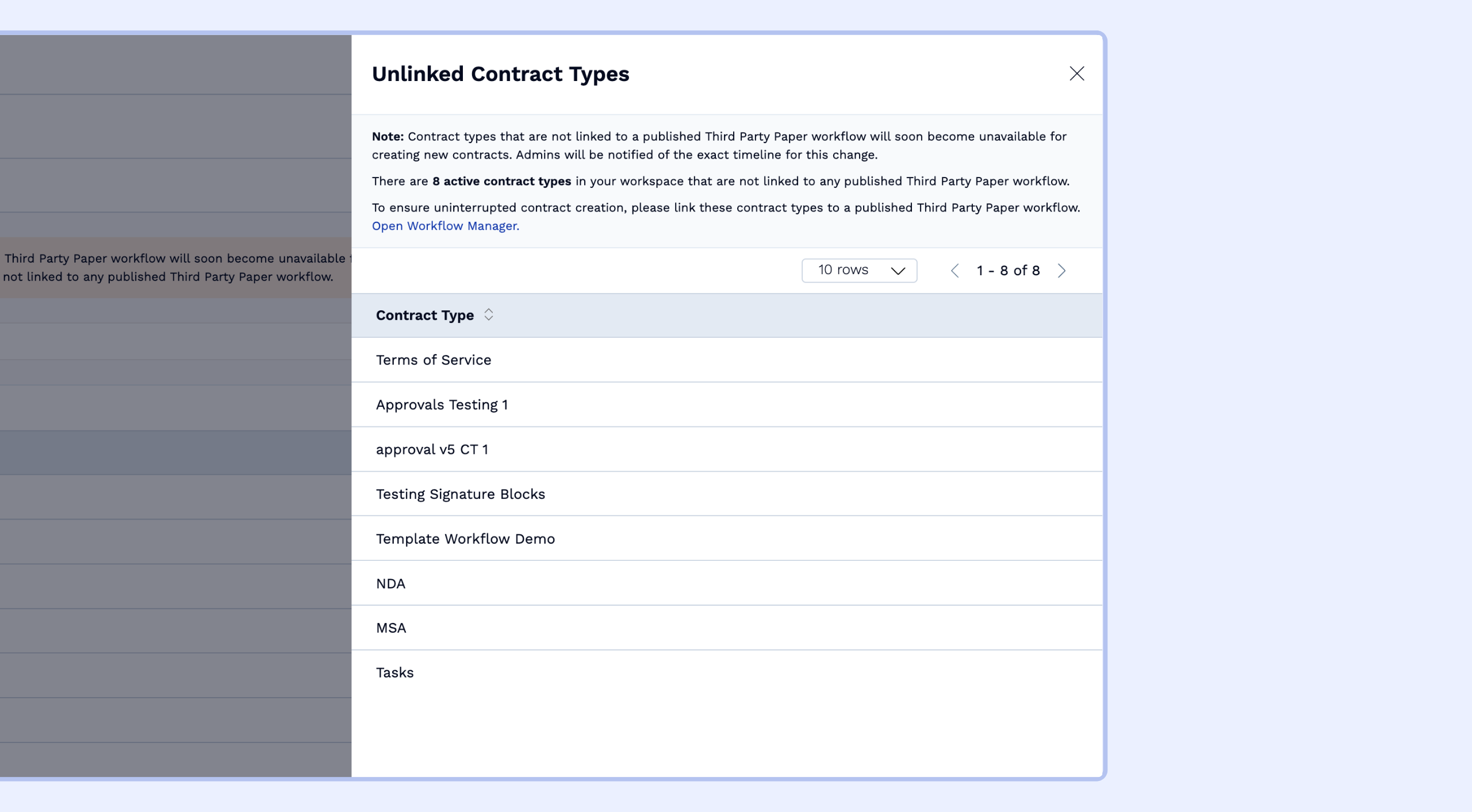 To support these improvements, each contract type needs to be linked to a published Third-Party Paper workflow. Linking ensures that existing settings from contract types are migrated properly into workflows, so your current configurations carry over smoothly.