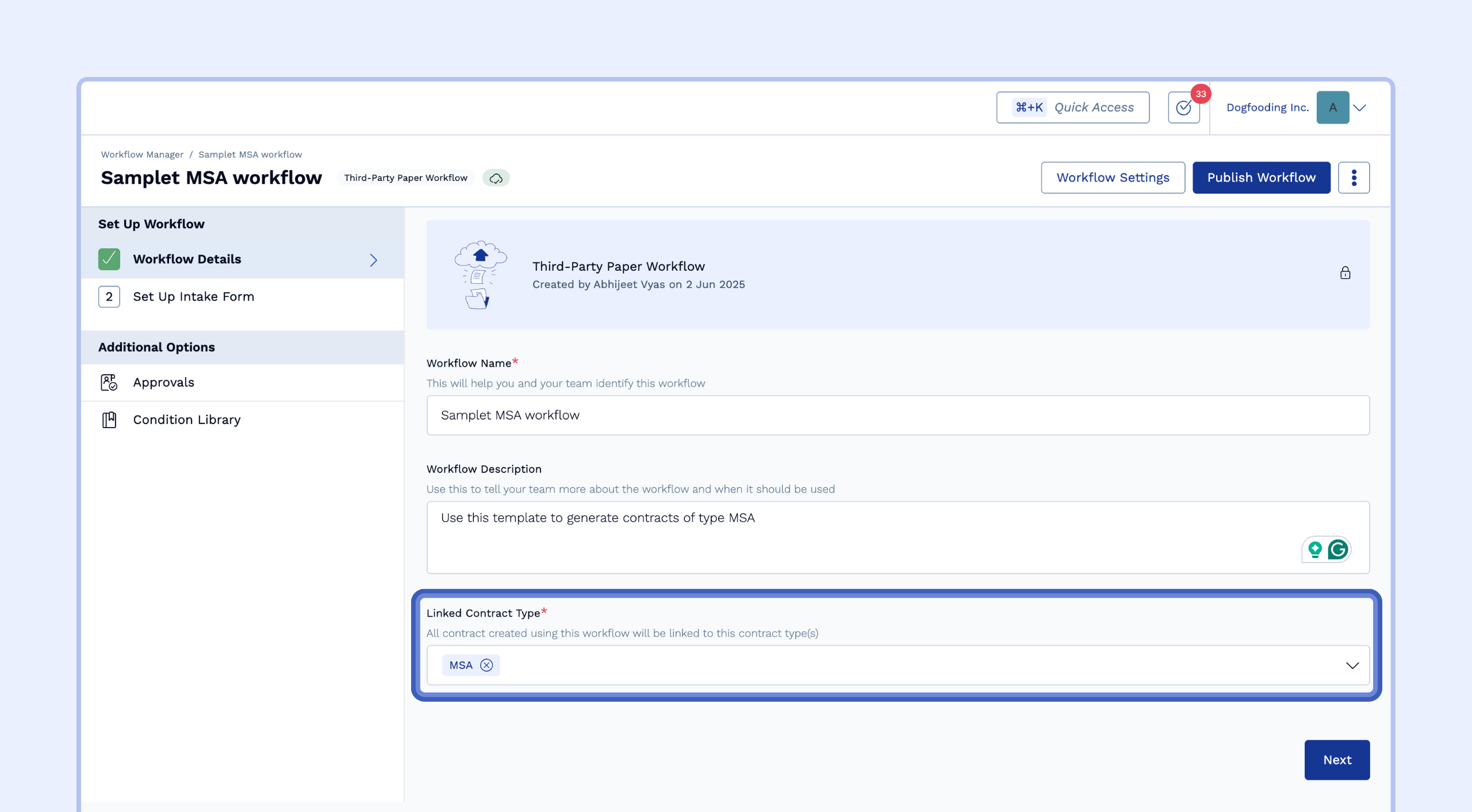 With an upcoming update, contract types will need to be mandatorily linked to a published Third-Party Paper workflow to create new 'Third-Party Paper' contracts or 'Upload For Signature' contracts. With this update, only contract types linked to a Third-Party Paper workflow will be available for creating new Third-Party Paper contracts. This update ensures workflow consistency across your contract management process and enables planned workflow enhancements.