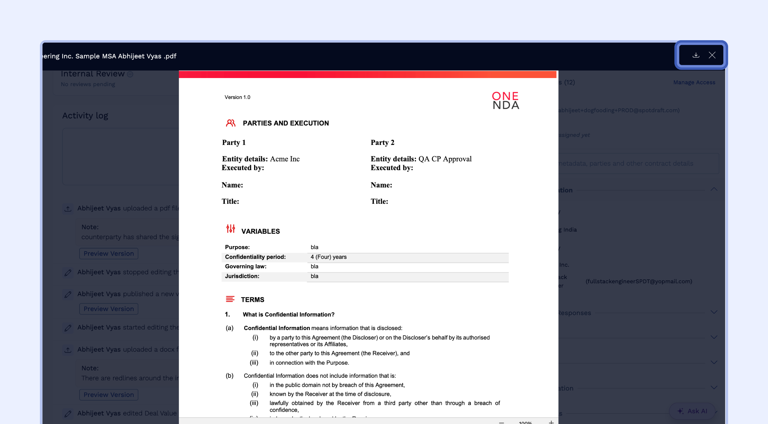 Click Download icon: You can download the contract version by clicking on the Download icon on the top right.