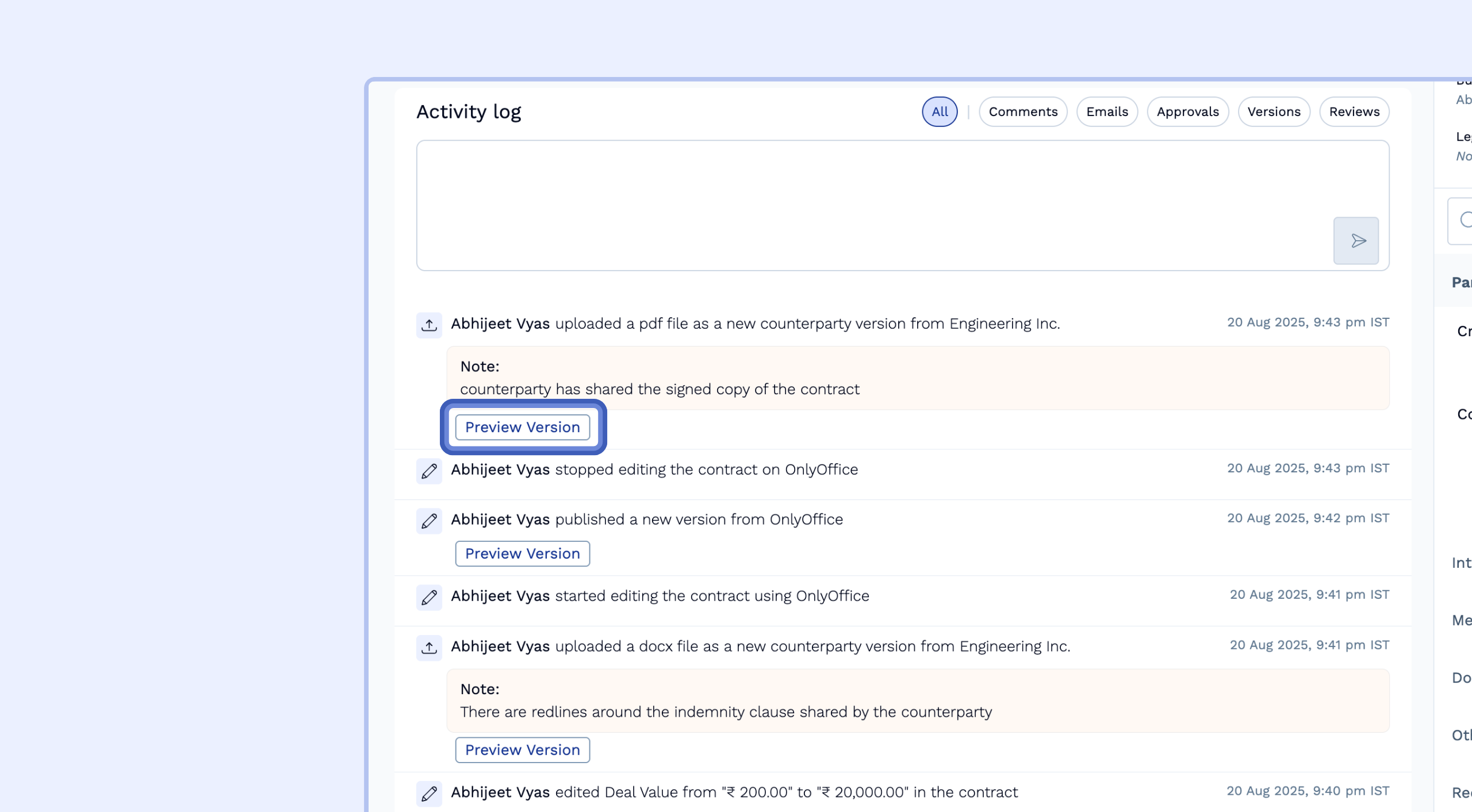 Every time a significant action occurs—such as saving edits, uploading a counterparty's redlines, or finalizing a contract for execution—SpotDraft creates a new, numbered version. This creates a complete, auditable timeline of your contract's evolution, allowing you to see every change and access previous versions whenever needed.