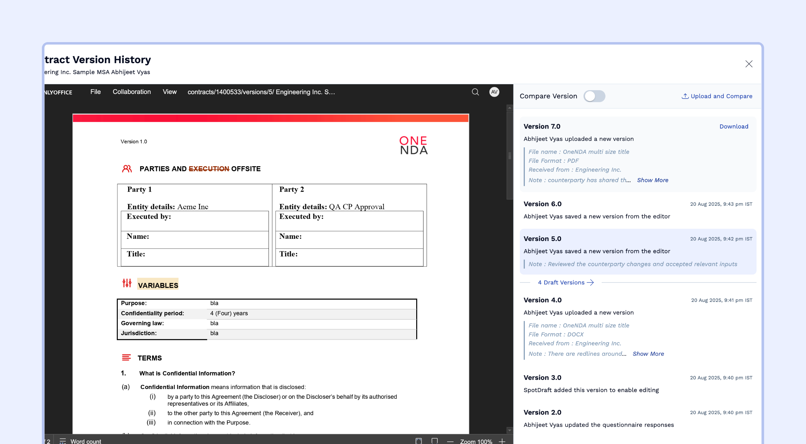 SpotDraft allows you to run a detailed comparison between two published versions to easily identify all changes.