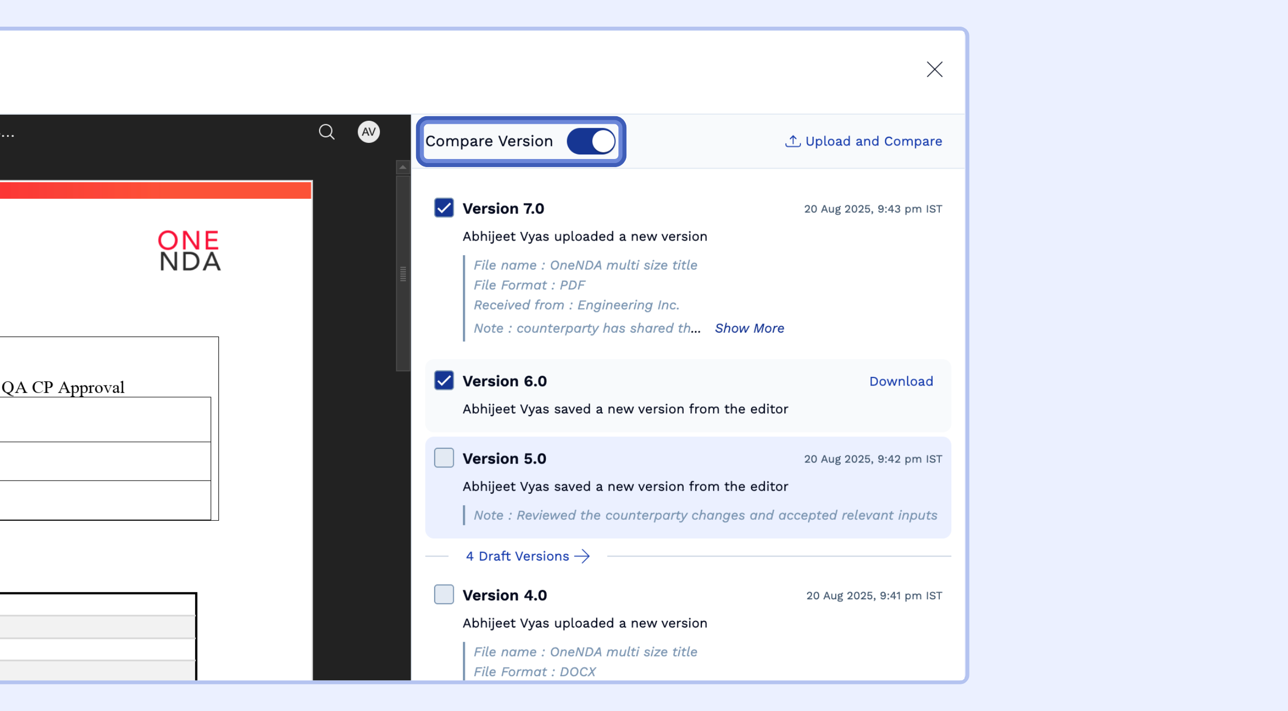 Upload as New Version: If you want to make the comparison results a permanent part of the contract history, click Upload as New Version to save the compared document back to SpotDraft.
