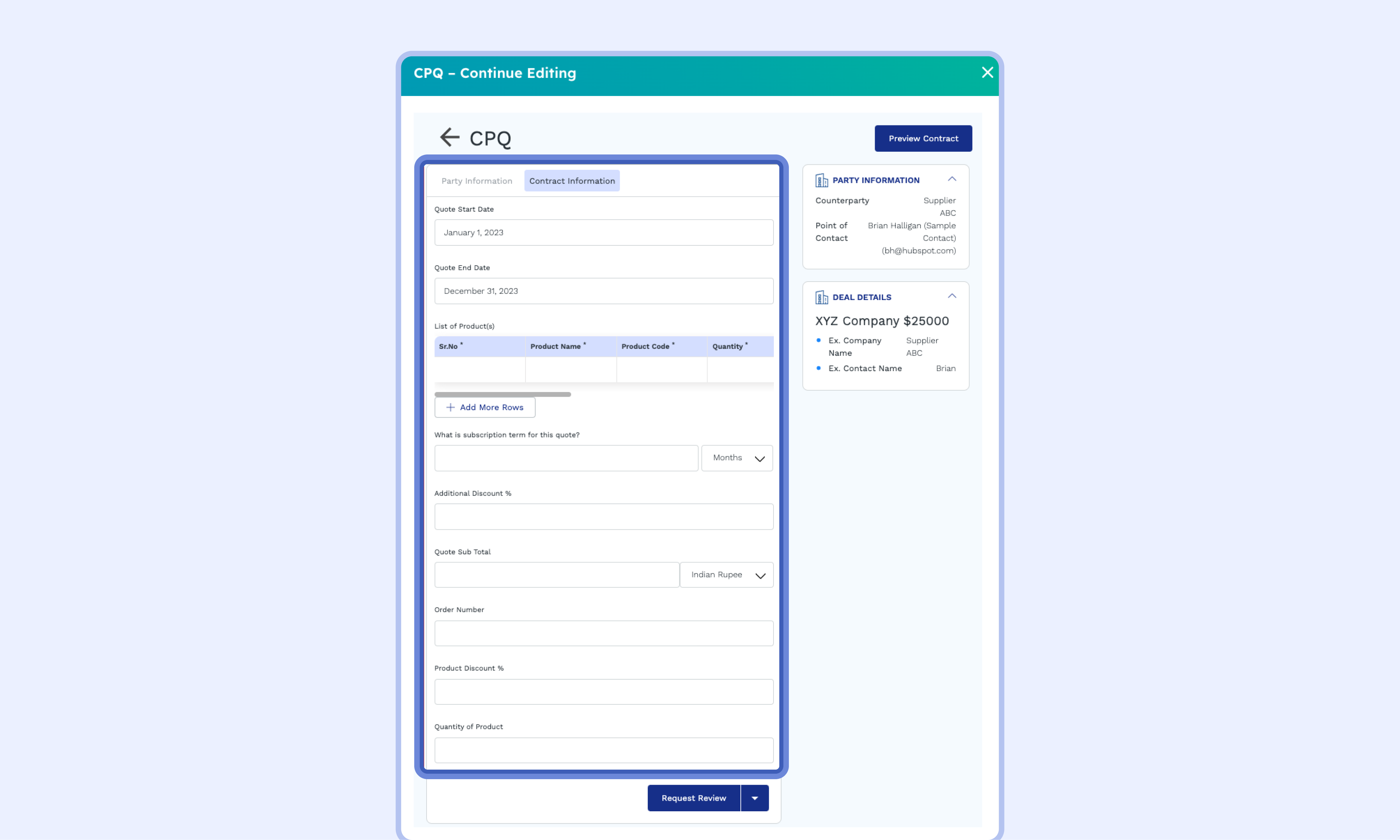 5 - Review the Contract Information fields. The fields show the Contract Template’s questions, with the values from HubSpot. Use the mapping document used when configuring the Integration to ensure the mapping is correct.