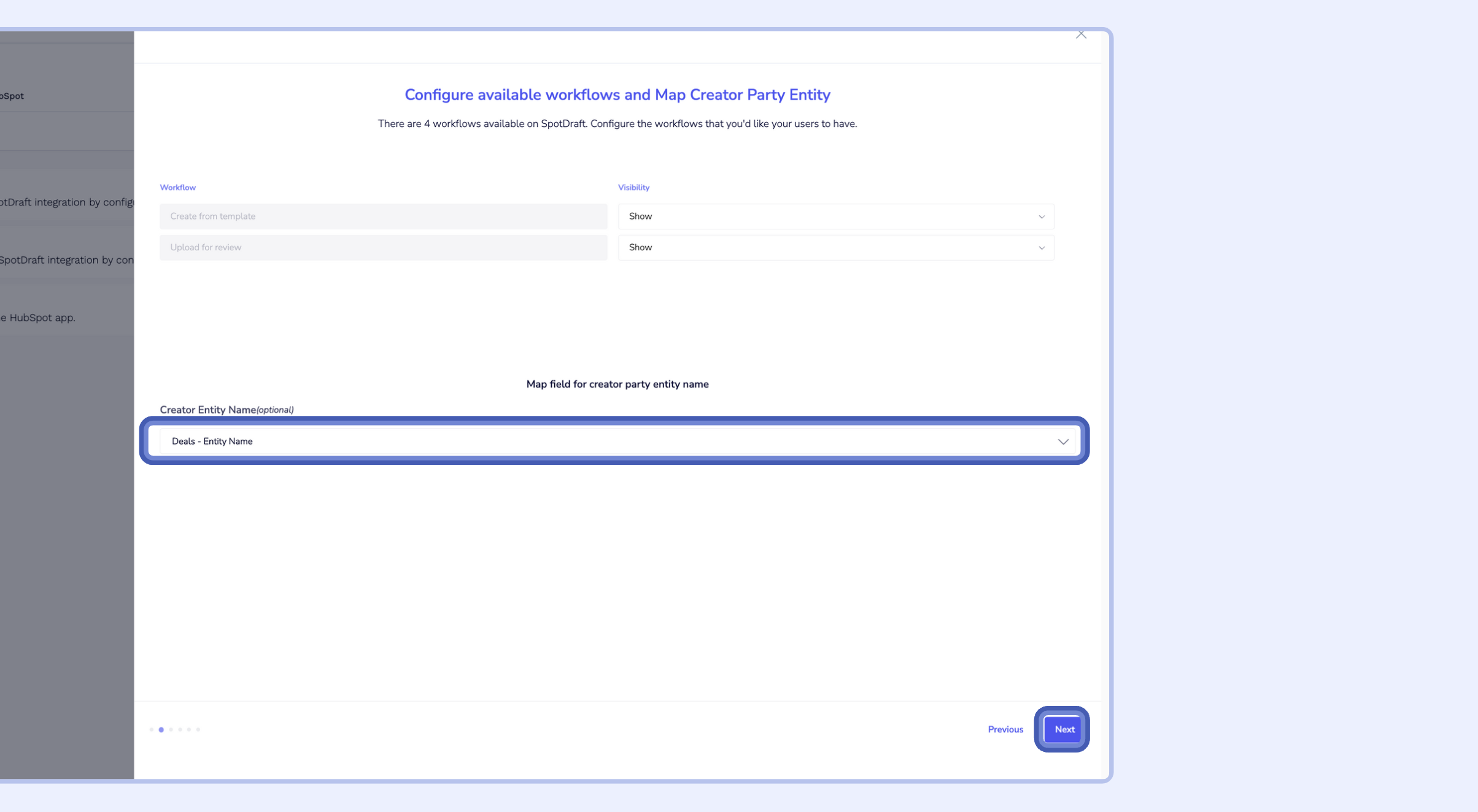 Note. It will also lay the foundation for your Contract templates in SpotDraft to be used in HubSpot. However the subsequent ‘Configuring the HubSpot integration for individual workflows’ section will need to be completed to use this feature.