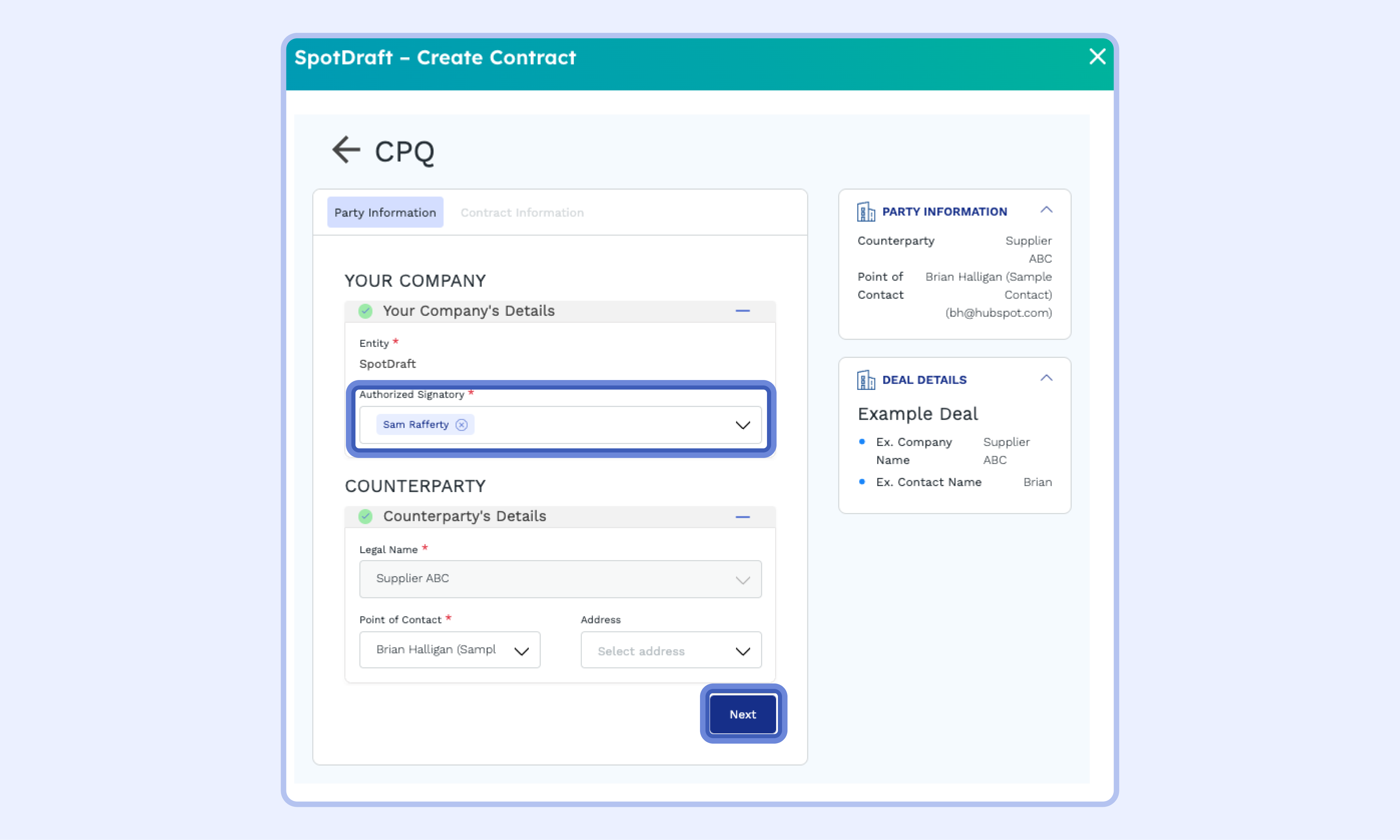 This wizard page enables you to aid the process in HubSpot such that as the salesperson is creating the Contract, key HubSpot properties are shown on the same screen in ‘Deal Details’ simplifying the process for them.
