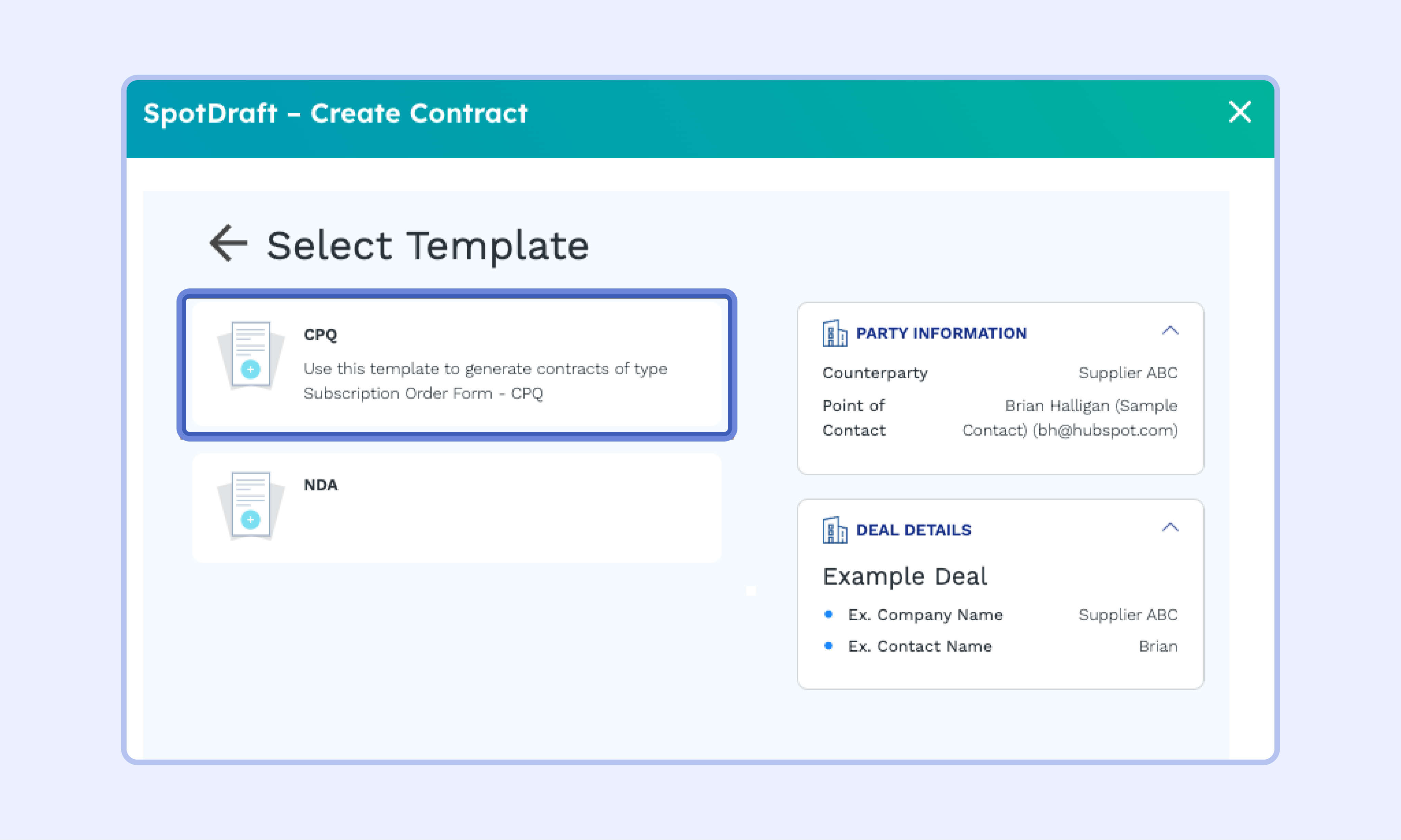 Note. This is not required to upload Third Party Contracts in HubSpot and send them to SpotDraft. - Select Contract Templates: Determine which SpotDraft contract template requires integration with HubSpot (e.g., CPQ, NDA).