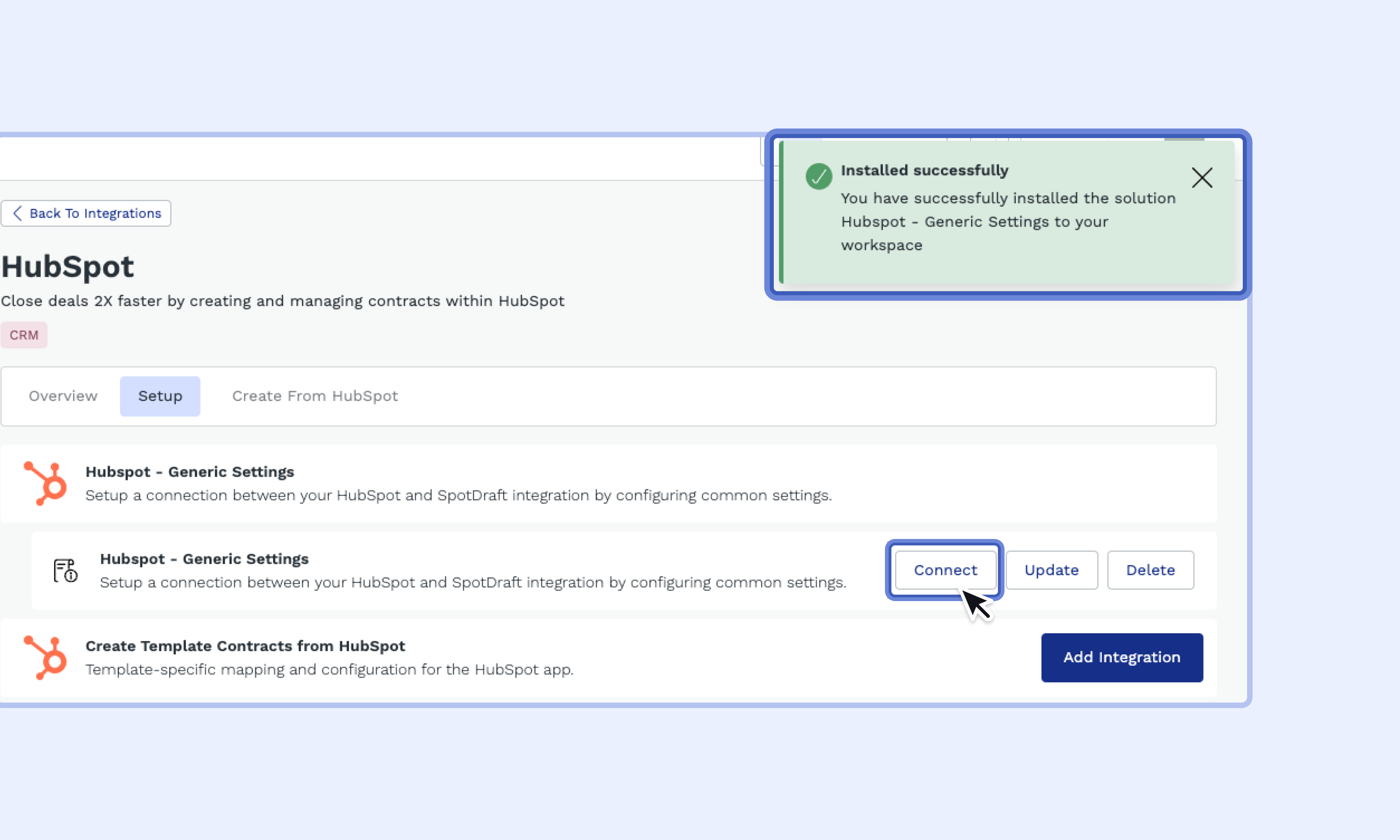 Log in to SpotDraft, navigate to Settings → Integrations → CRM, open the Hubspot card select Setup from the top menu, then click on the Connect button on the Generic Settings option to open the setup wizard.